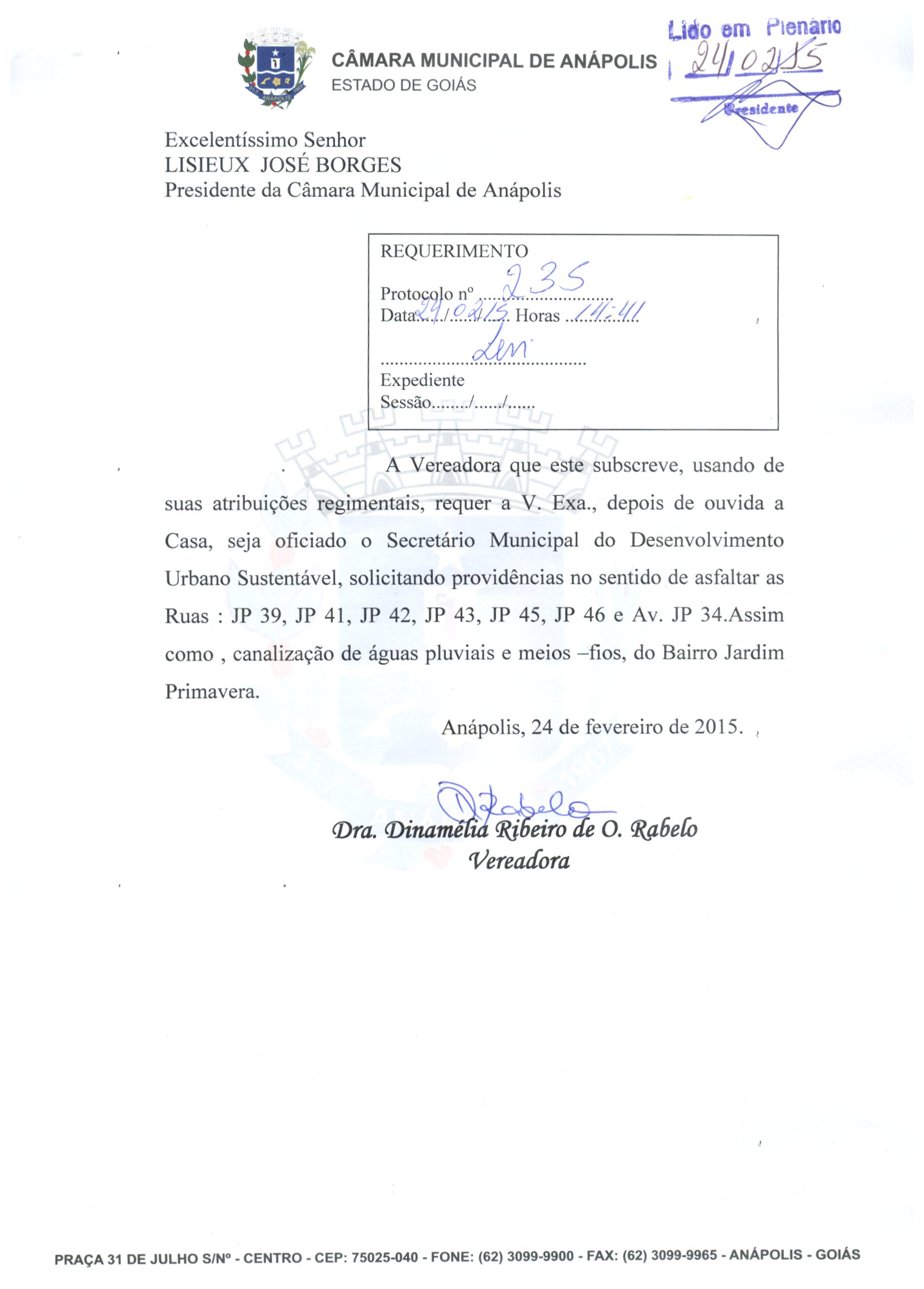Ementa: A VEREADORA QUE ESTE SUBSCREVE, USANDO DE SUAS ATRIBUIÇÕES REGIMENTAIS, REQUER A V. EXA., DEPOIS DE OUVIDA A CASA, SEJA OFICIADO O SECRETÁRIO MUNICIPAL DO DESENVOLVIMENTO URBANO SUSTENTÁVEL, SOLICITANDO PROVIDÊNCIAS NO SENTIDO DE ASFALTAR AS RUAS : JP 39, JP 41, JP 42, JP 43, JP 45, JP 46 E AV. JP 34. ASSIM COMO , CANALIZAÇÃO DE ÁGUAS PLUVIAIS E MEIOS-FIOS, DO BAIRRO JARDIM PRIMAVERA.