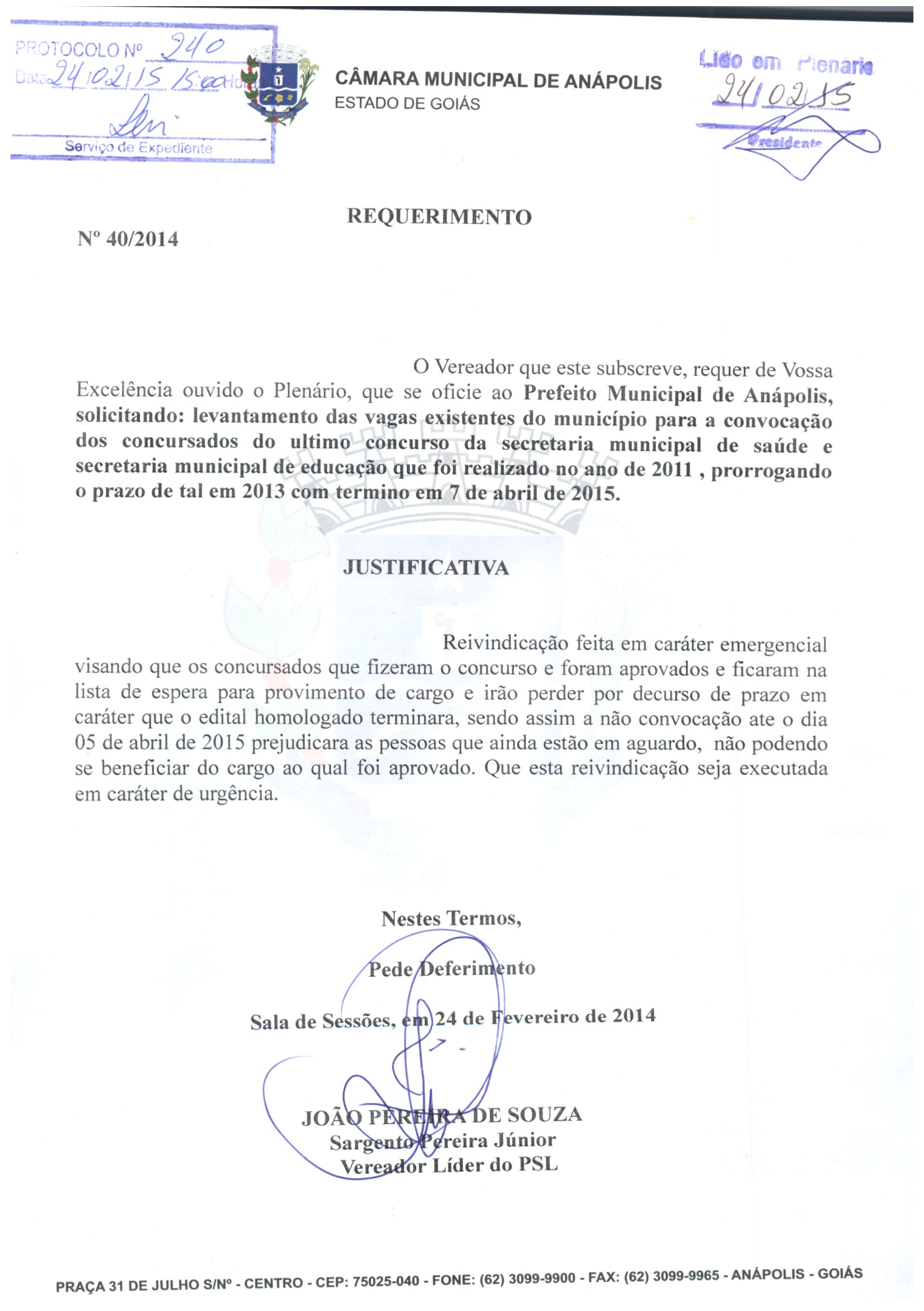 Ementa: O VEREADOR QUE ESTE SUBSCREVE, REQUER DE VOSSA EXCELÊNCIA OUVIDO O PLENÁRIO, QUE SE OFICIE AO PREFEITO MUNICIPAL DE ANÁPOLIS, SOLICITANDO: LEVANTAMENTO DAS VAGAS EXISTENTES DO MUNICÍPIO PARA A CONVOCAÇÃO DOS CONCURSADOS DO ÚLTIMO CONCURSO DA SECRETARIA MUNICIPAL DE SAÚDE E SECRETARIA MUNICIPAL DE EDUCAÇÃO QUE FOI REALIZADO NO ANO DE 2011 , PRORROGANDO O PRAZO DE TAL EM 2013 COM TÉRMINO EM 7 DE ABRIL DE 2015.