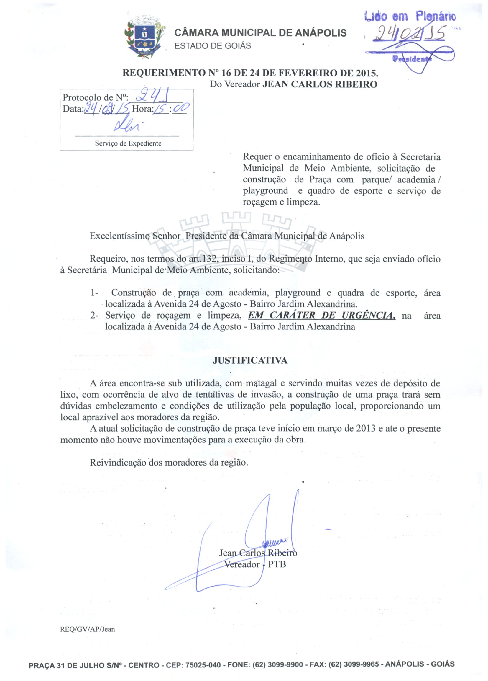 Ementa: REQUEIRO, NOS TERMOS DO ART.132, INCISO I, DO REGIMENTO INTERNO, QUE SEJA ENVIADO OFÍCIO À SECRETARIA MUNICIPAL DE MEIO AMBIENTE, SOLICITANDO: 1- CONSTRUÇÃO DE PRAÇA COM ACADEMIA, PLAYGROUND E QUADRA DE ESPORTE, ÁREA LOCALIZADA À AVENIDA 24 DE AGOSTO - BAIRRO JARDIM ALEXANDRINA. 2- SERVIÇO DE ROÇAGEM E LIMPEZA, EM CARÁTER DE URGÊNCIA, NA ÁREA LOCALIZADA A AVENIDA 24 DE AGOSTO - BAIRRO JARDIM ALEXANDRINA