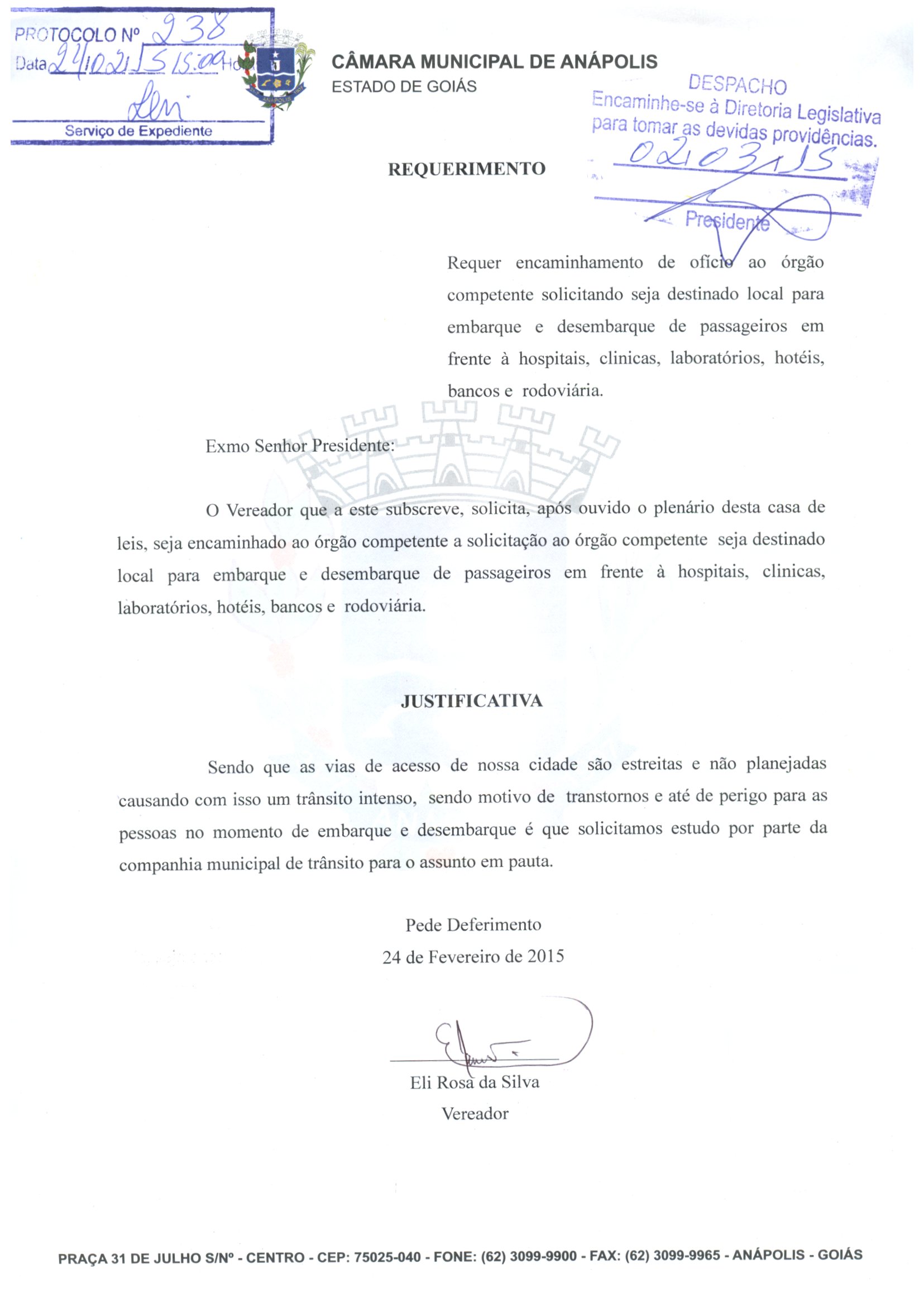 Ementa: O VEREADOR QUE A ESTE SUBSCREVE, SOLICITA, APÓS OUVIDO O PLENÁRIO DESTA CASA DE LEIS, SEJA ENCAMINHADO AO ÓRGÃO COMPETENTE A SOLICITAÇÃO AO ÓRGÃO COMPETENTE SEJA DESTINADO LOCAL PARA EMBARQUE E DESEMBARQUE DE PASSAGEIROS EM FRENTE A HOSPITAIS, CLÍNICAS, LABORATÓRIOS, HOTEL, BANCOS E RODOVIÁRIA.