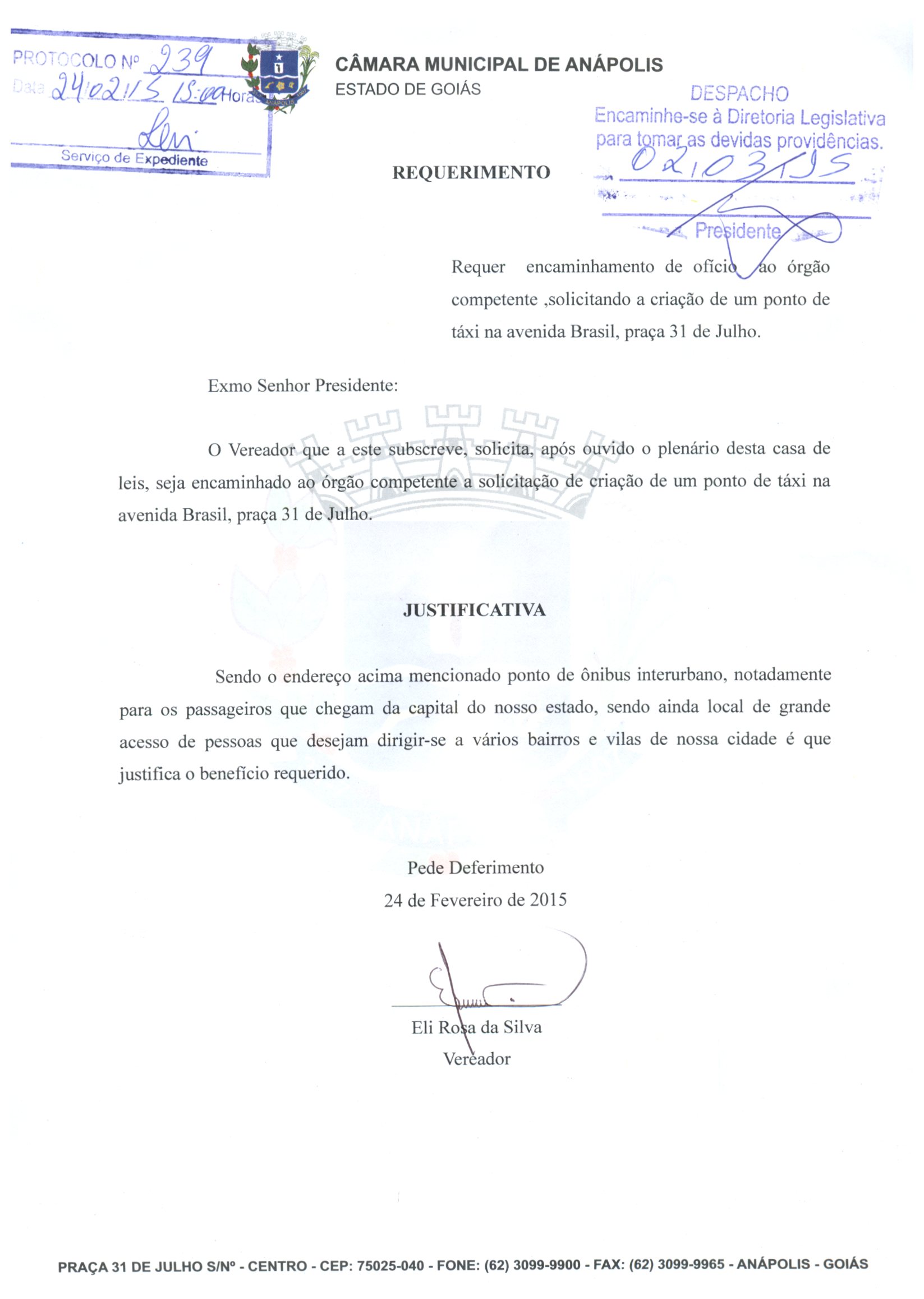 Ementa: O VEREADOR QUE A ESTE SUBSCREVE, SOLICITA, APÓS OUVIDO O PLENÁRIO DESTA CASA DE LEIS, SEJA ENCAMINHADO AO ÓRGÃO COMPETENTE A SOLICITAÇÃO DE CRIAÇÃO DE UM PONTO DE TAXI NA AVENIDA BRASIL, PRAÇA 31 DE JULHO.