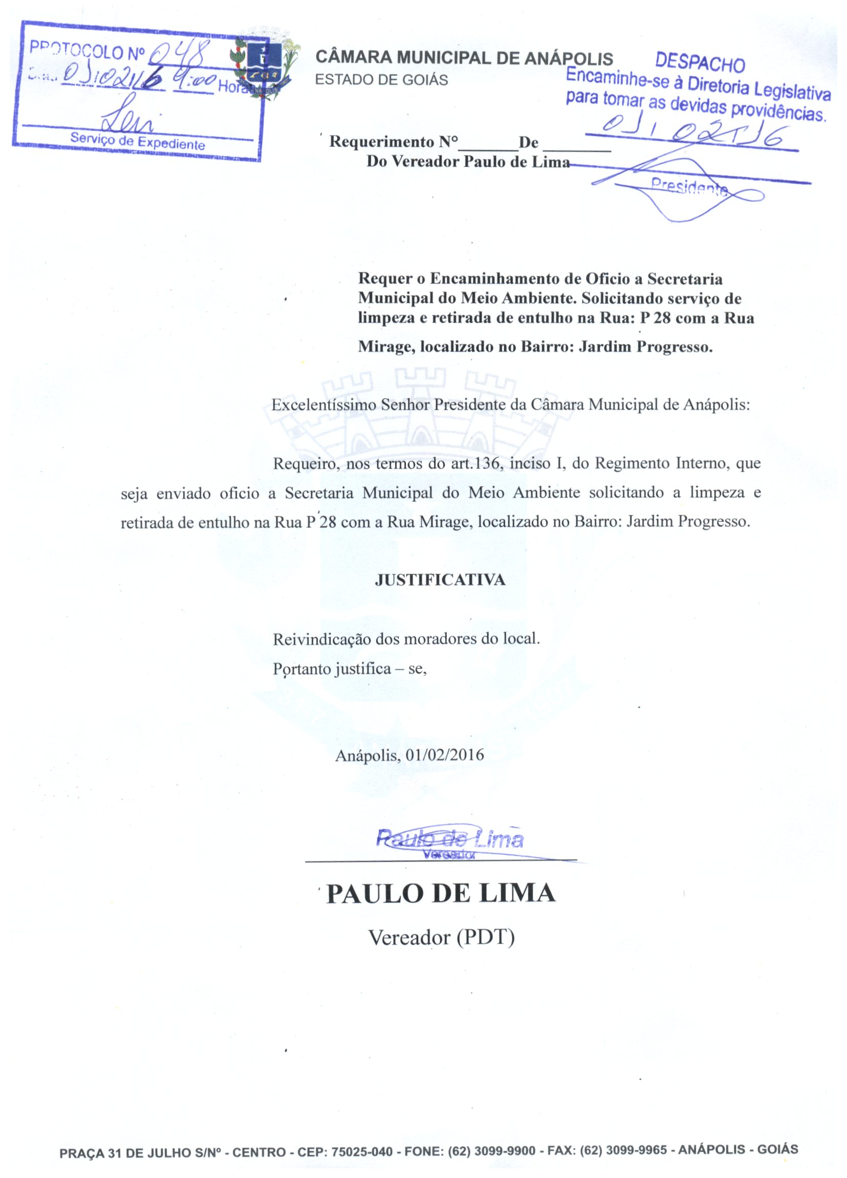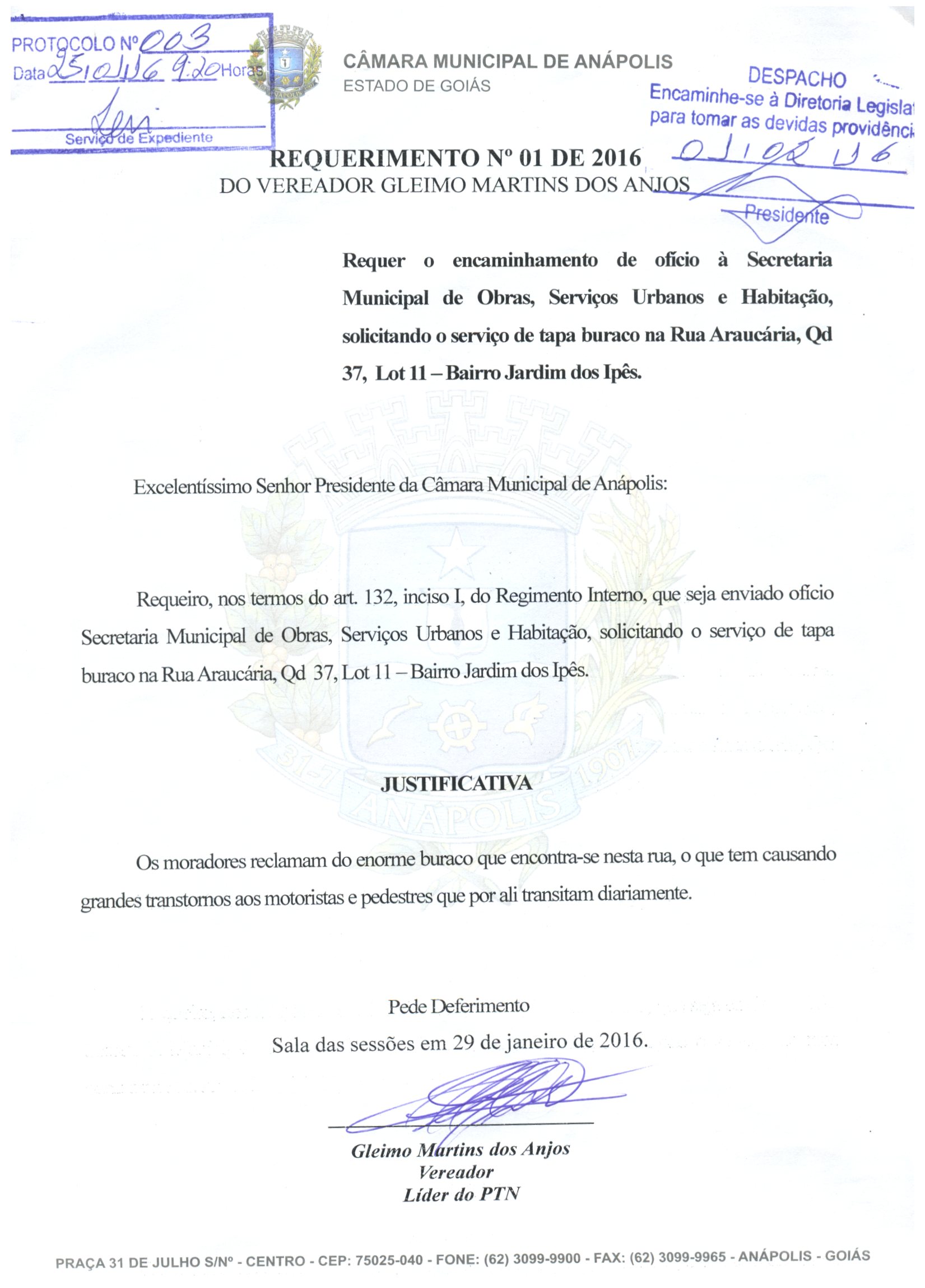 ![]() REQUER O ENCAMINHAMENTO DE OFÍCIO À SECRETARIA MUNICIPAL DE OBRAS, SERVIÇOS URBANOS, SOLICITAÇÃO DE INSTALAÇÃO DE LUMINÁRIAS NA VIA PARALELA, SAINDO DO VIADUTO DA BR-414, ATÉ O SETOR PIRINEUS.