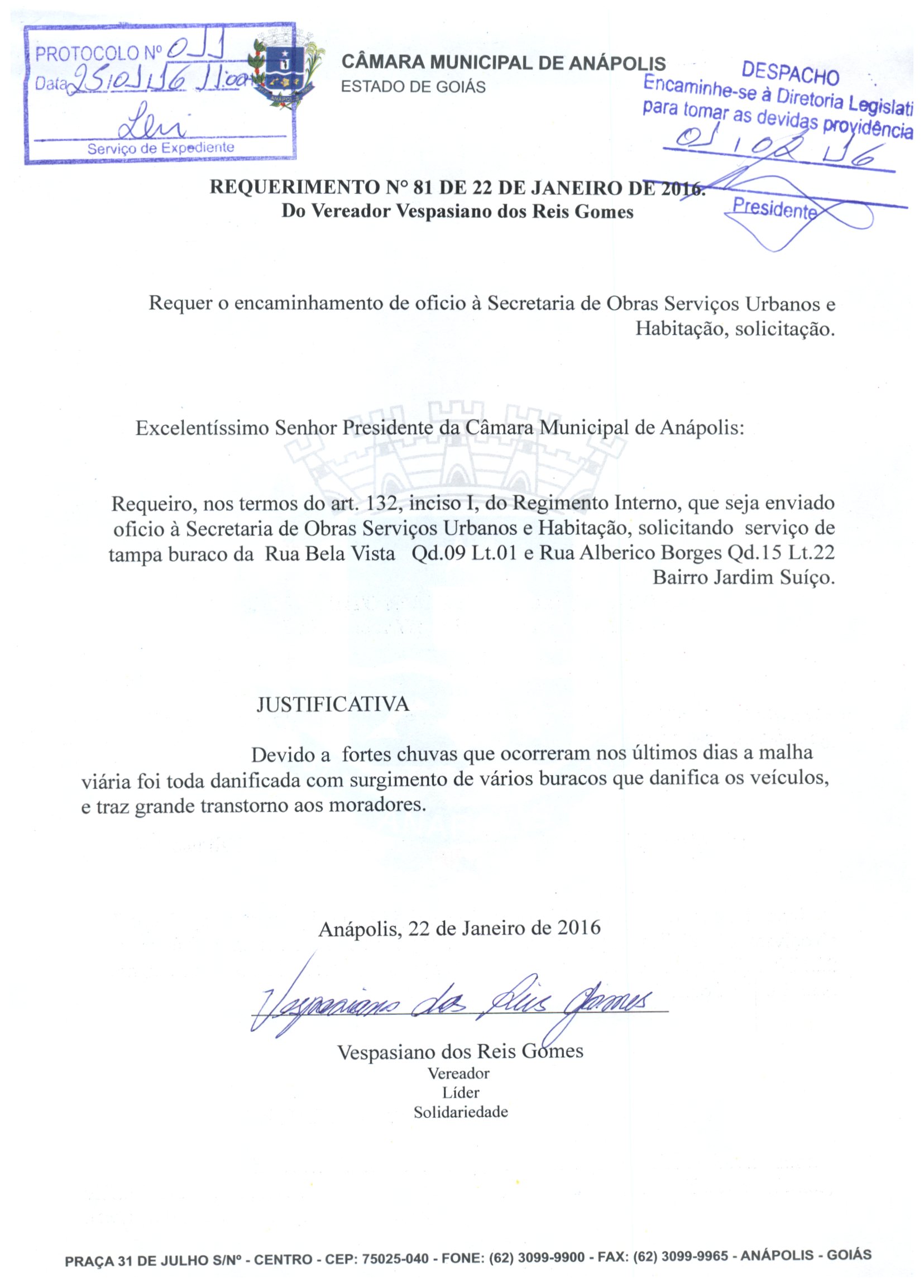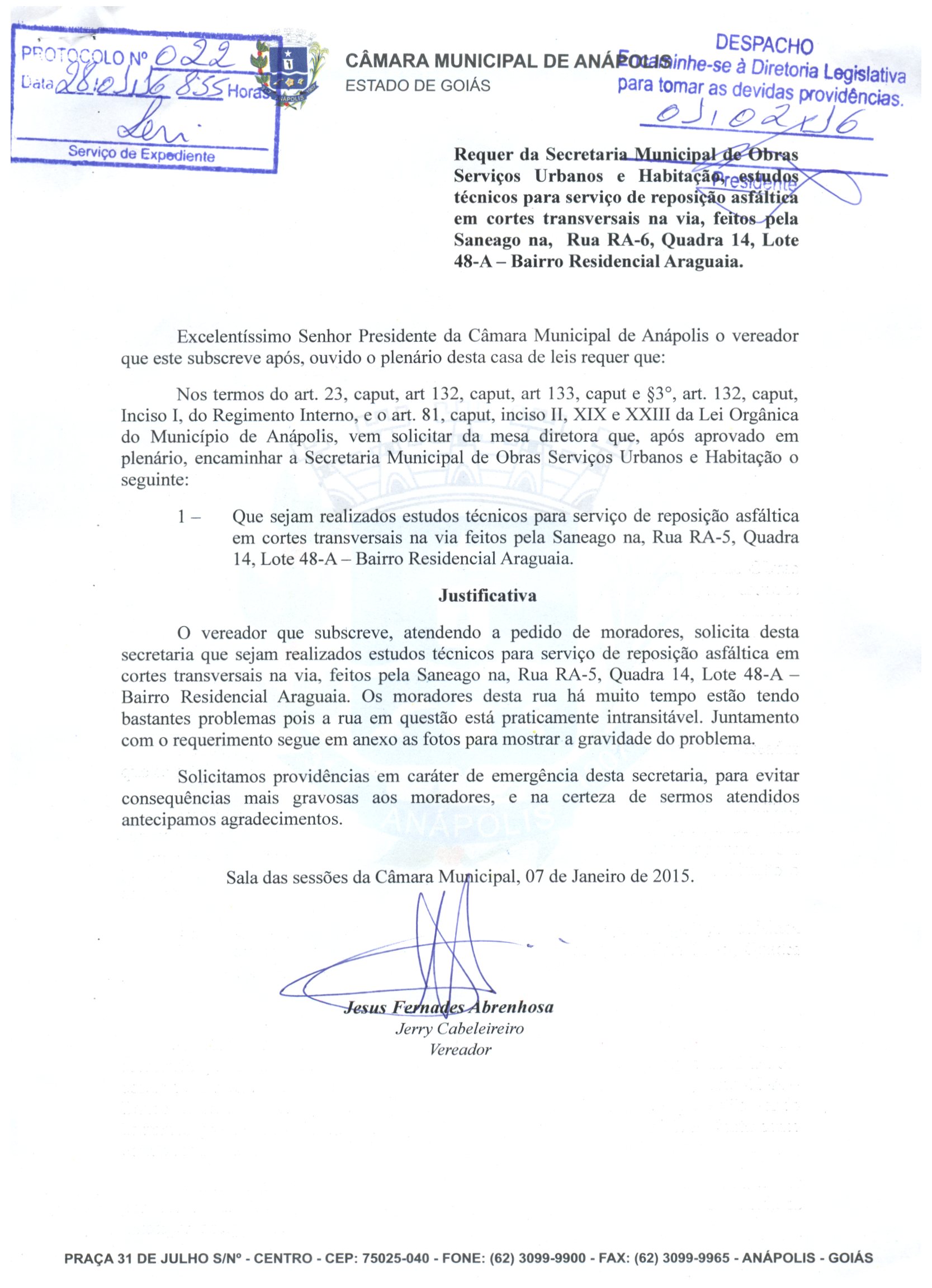 ![]() À SECRETARIA DE OBRAS, SERVIÇOS URBANOS E HABITAÇÃO SOLICITANDO ESTUDOS TÉCNICOS PARA O SERVIÇO DE REPOSIÇÃO ASFÁLTICA, EM CORTES TRANSVERSAIS NA VIA FEITOS PELA SANEAGO, NA RUA RA-5 QD. 14 LT. 48-A.