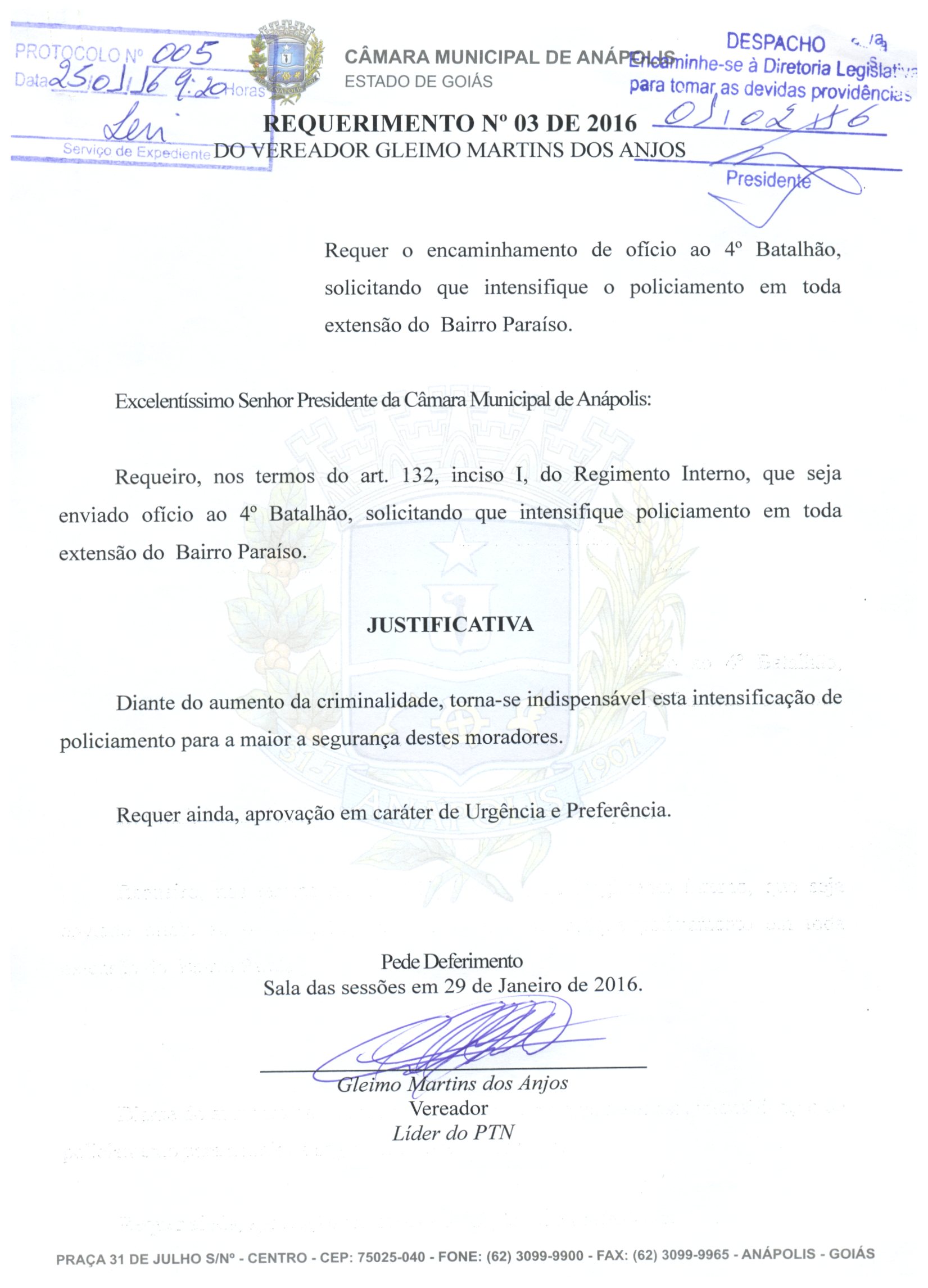 ![]() REQUER O ENCAMINHAMENTO DE OFÍCIO AO COMANDO DO 3º CRPM, SOLICITANDO POLICIAMENTO PREVENTIVO PARA O SETOR ESTÂNCIA VALE DAS BRISAS, ABAIXO DO RES. LEBLON.