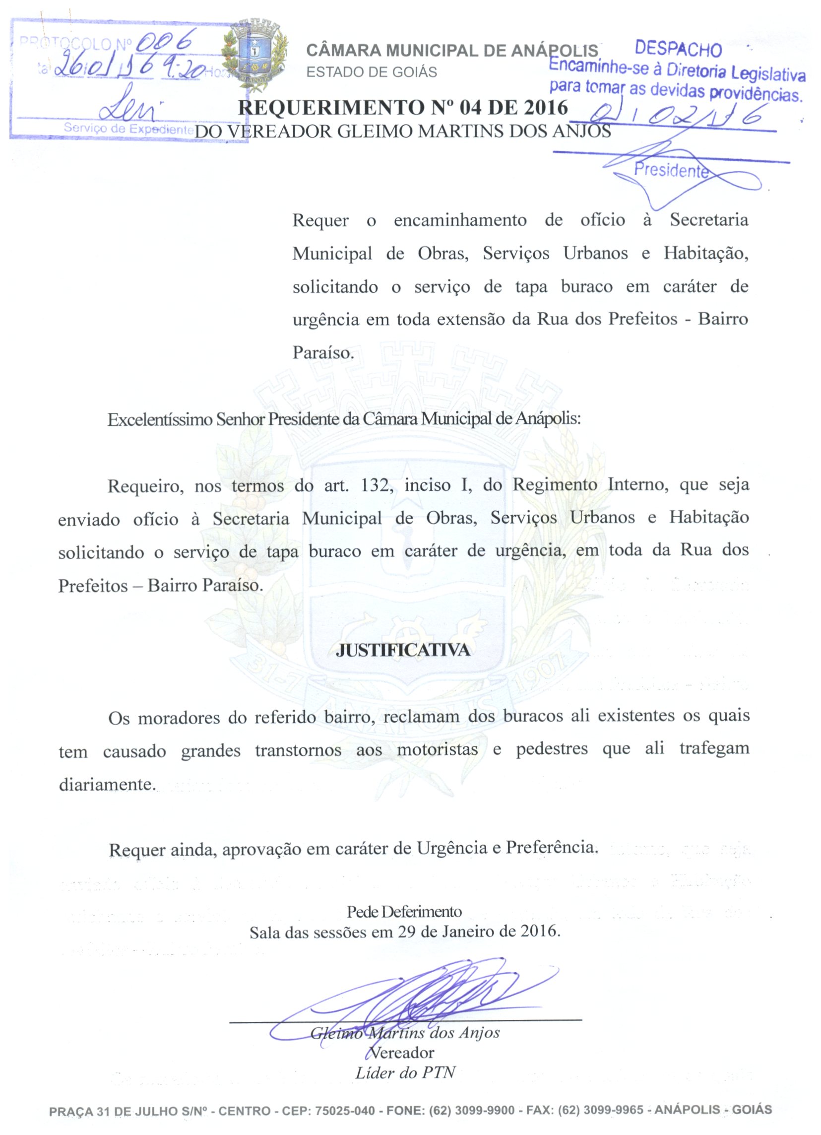 ![]() À SECRETARIA DE OBRAS, SERVIÇOS URBANOS E HABITAÇÃO SOLICITANDO O TAPAMENTO DE BURACOS, EM CARÁTER DE URGÊNCIA, EM TODA A EXTENSÃO DA RUA DOS PREFEITOS.