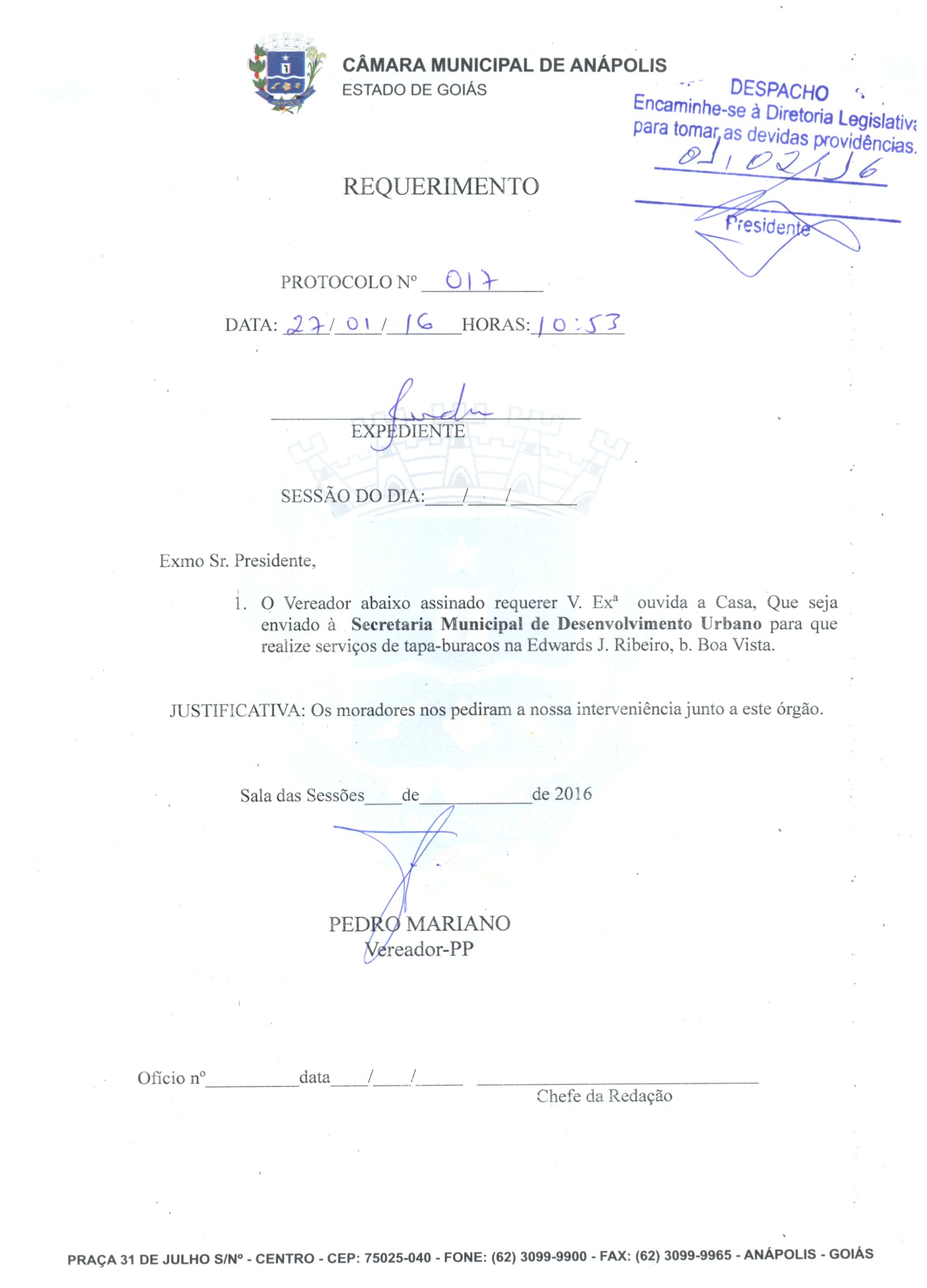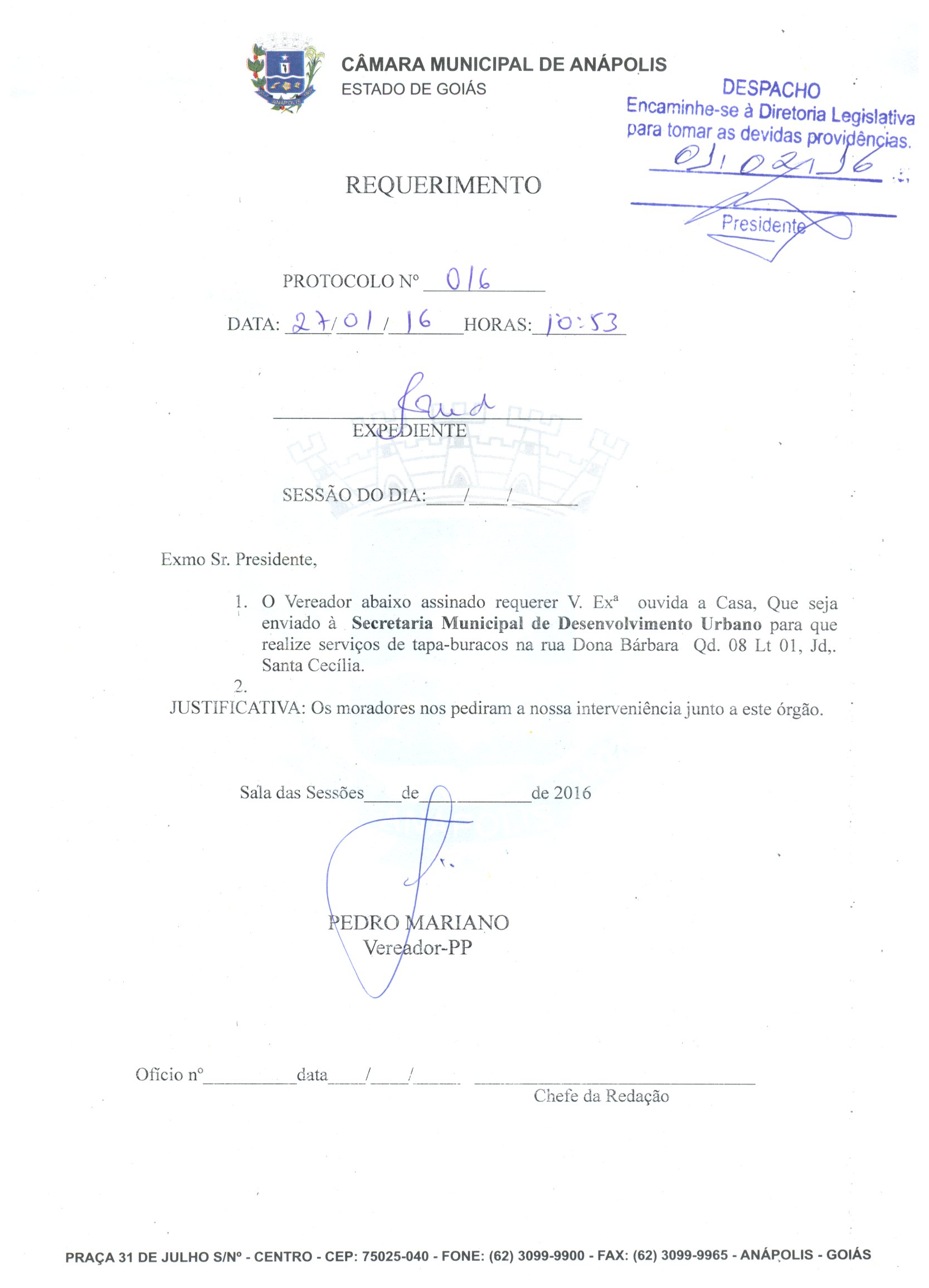 ![]() À SECRETARIA DE OBRAS, SERVIÇOS URBANOS E HABITAÇÃO SOLICITANDO O TAPAMENTO DE BURACOS NA RUA DONA BÁRBARA QD. 08 LT. 01.