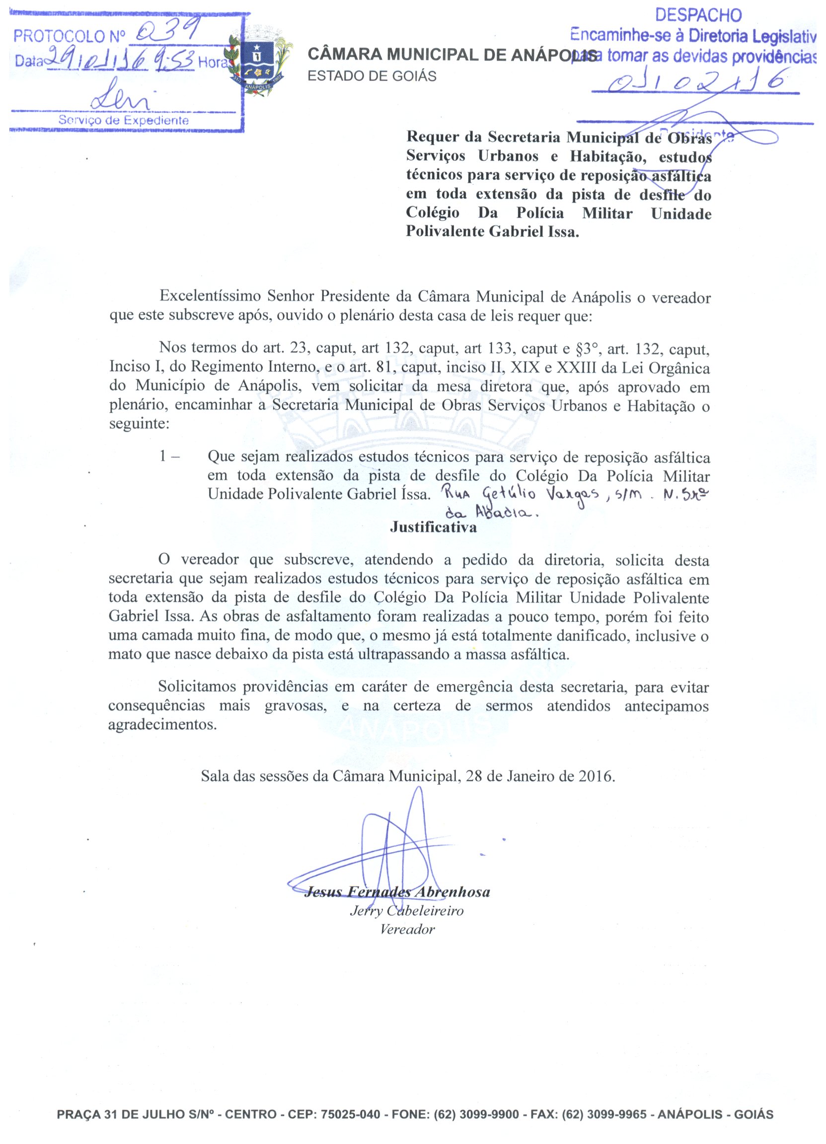 ![]() À SECRETARIA MUNICIPAL DE OBRAS, SERVIÇOS URBANOS E HABITAÇÃO, SOLICITANDO ESTUDOS TÉCNICOS PARA O SERVIÇO DE REPOSIÇÃO ASFÁLTICA EM TODA EXTENSÃO DA PISTA DE DESFILE DO COLÉGIO DA POLÍCIA MILITAR, UNIDADE POLIVALENTE GABRIEL ISSA.