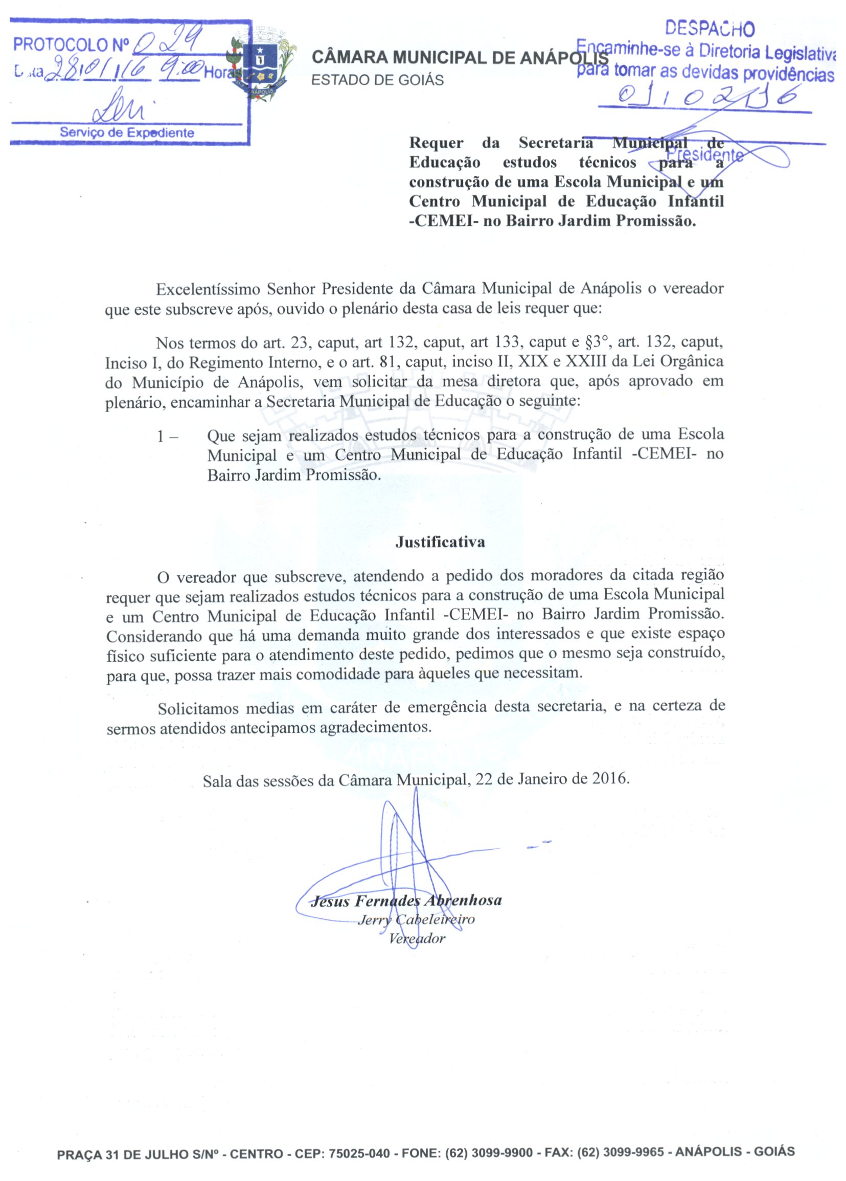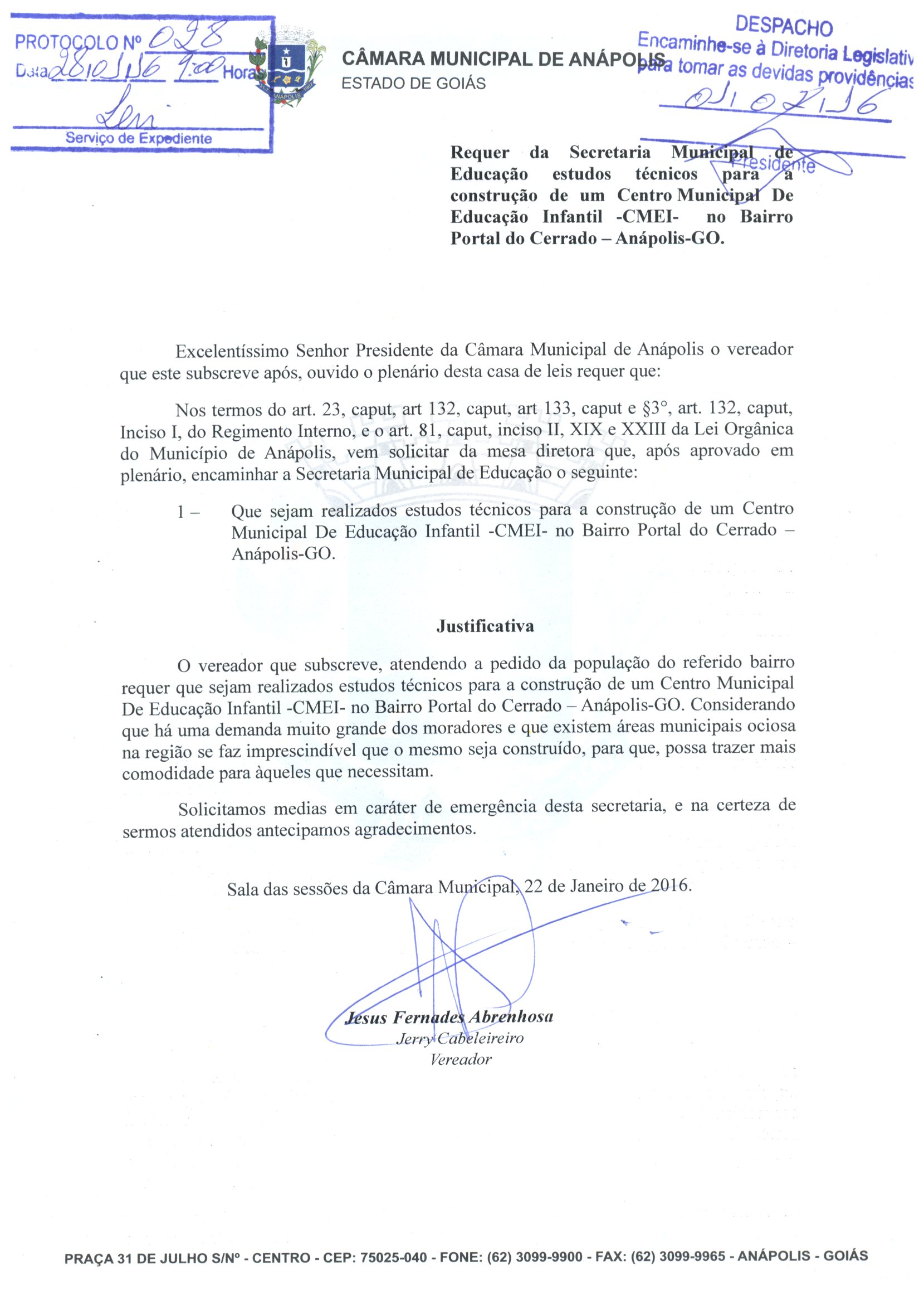 ![]() À SECRETARIA MUNICIPAL DE EDUCAÇÃO SOLICITANDO ESTUDOS TÉCNICOS PARA A CONSTRUÇÃO DE UM CENTRO MUNICIPAL DE EDUCAÇÃO INFANTIL.