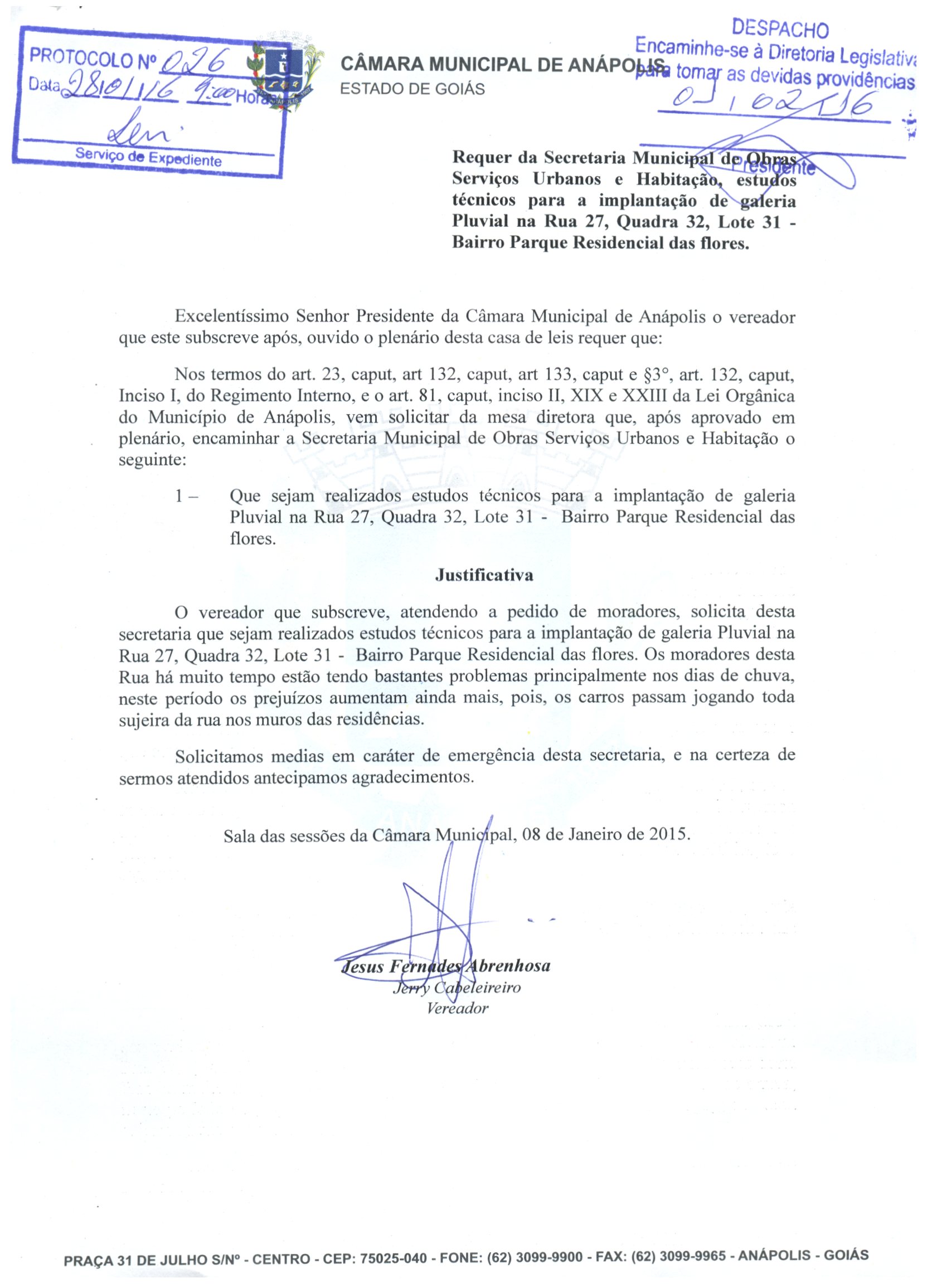 ![]() À SECRETARIA DE OBRAS, SERVIÇOS URBANOS E HABITAÇÃO SOLICITANDO ESTUDOS TÉCNICOS PARA A IMPLANTAÇÃO DE GALERIA PLUVIAL NA RUA 27 QD. 32 LT. 31.