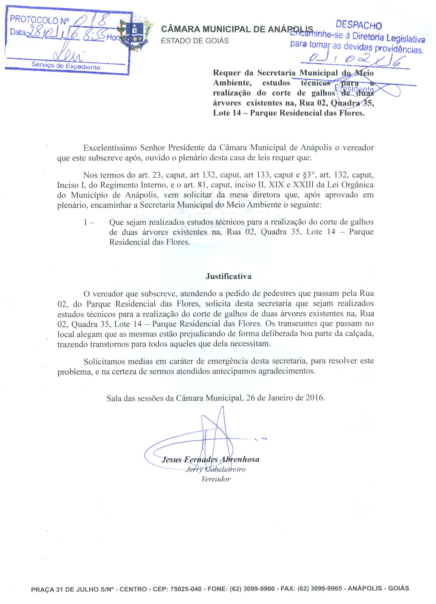 ![]() À SMMA SOLICITANDO A REALIZAÇÃO DE ESTUDOS TÉCNICOS PARA A REALIZAÇÃO DE CORTE DE GALHOS DE DUAS ÁRVORES EXISTENTES NA RUA 02 QD. 35 LT. 14.