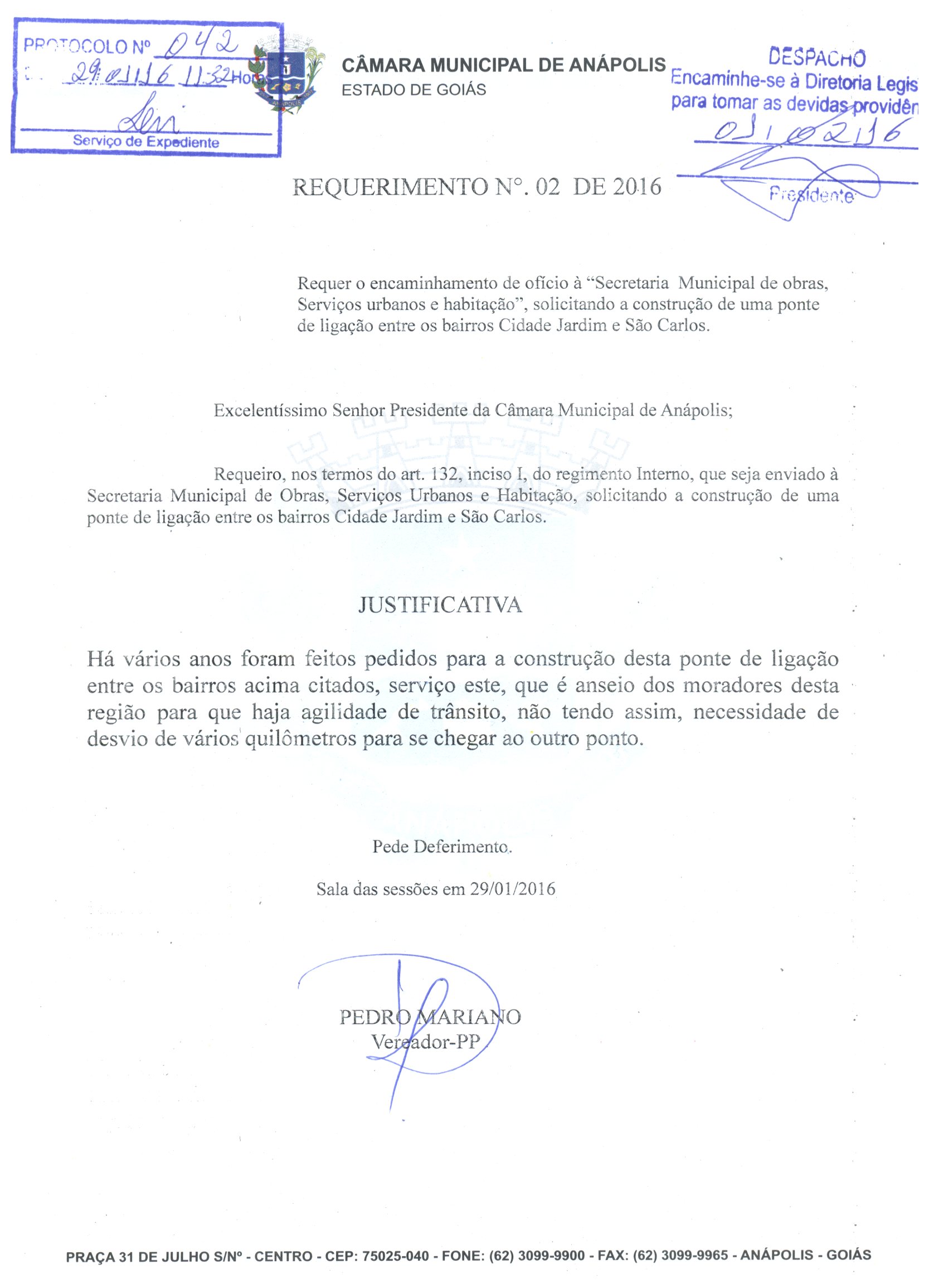 ![]() À SECRETARIA DE OBRAS, SERVIÇOS URBANOS E HABITAÇÃO SOLICITANDO A CONSTRUÇÃO DE UMA PONTE DE LIGAÇÃO ENTRE OS BAIRROS CIDADE JARDIM E SÃO CARLOS.