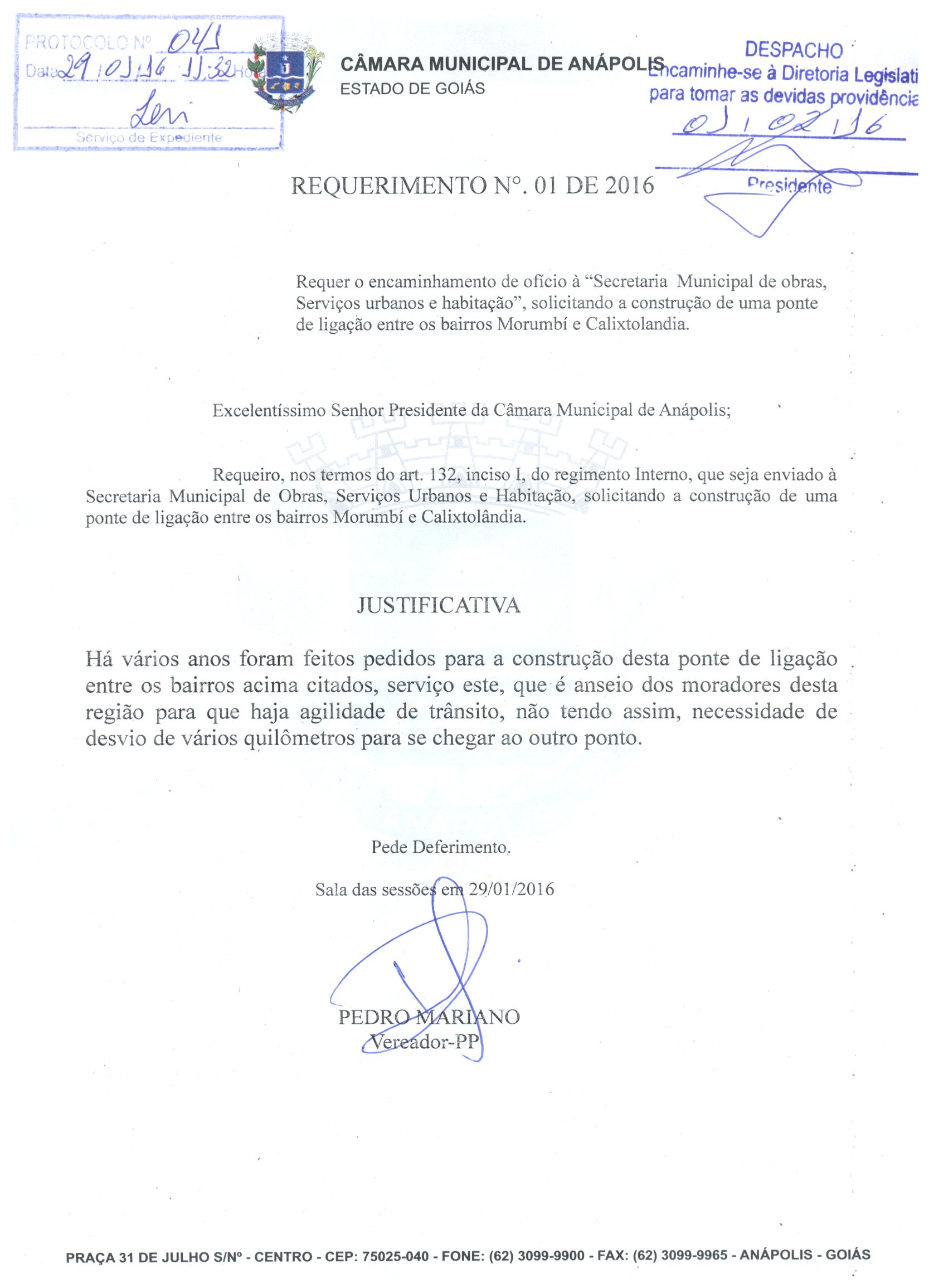 ![]() À SECRETARIA DE OBRAS, SERVIÇOS URBANOS E HABITAÇÃO SOLICITANDO A CONSTRUÇÃO DE UMA PONTE ENTRE OS BAIRROS MORUMBI E CALIXTÓPOLIS.