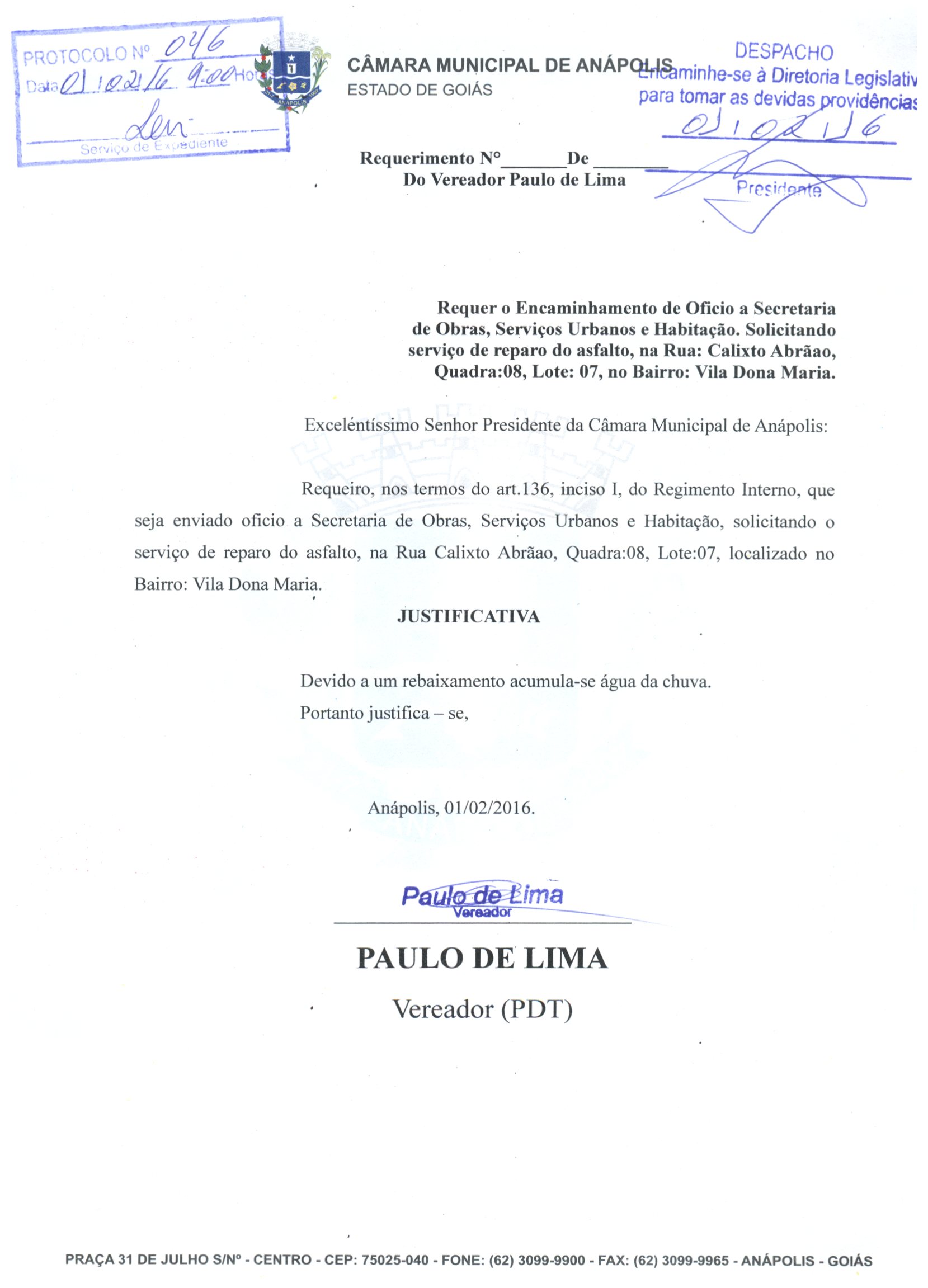 ![]() À SECRETARIA DE OBRAS, SERVIÇOS URBANOS E HABITAÇÃO SOLICITANDO O REPARO DO ASFALTO NA RUA CALIXTO ABRAÃO QD. 08 LT. 07.