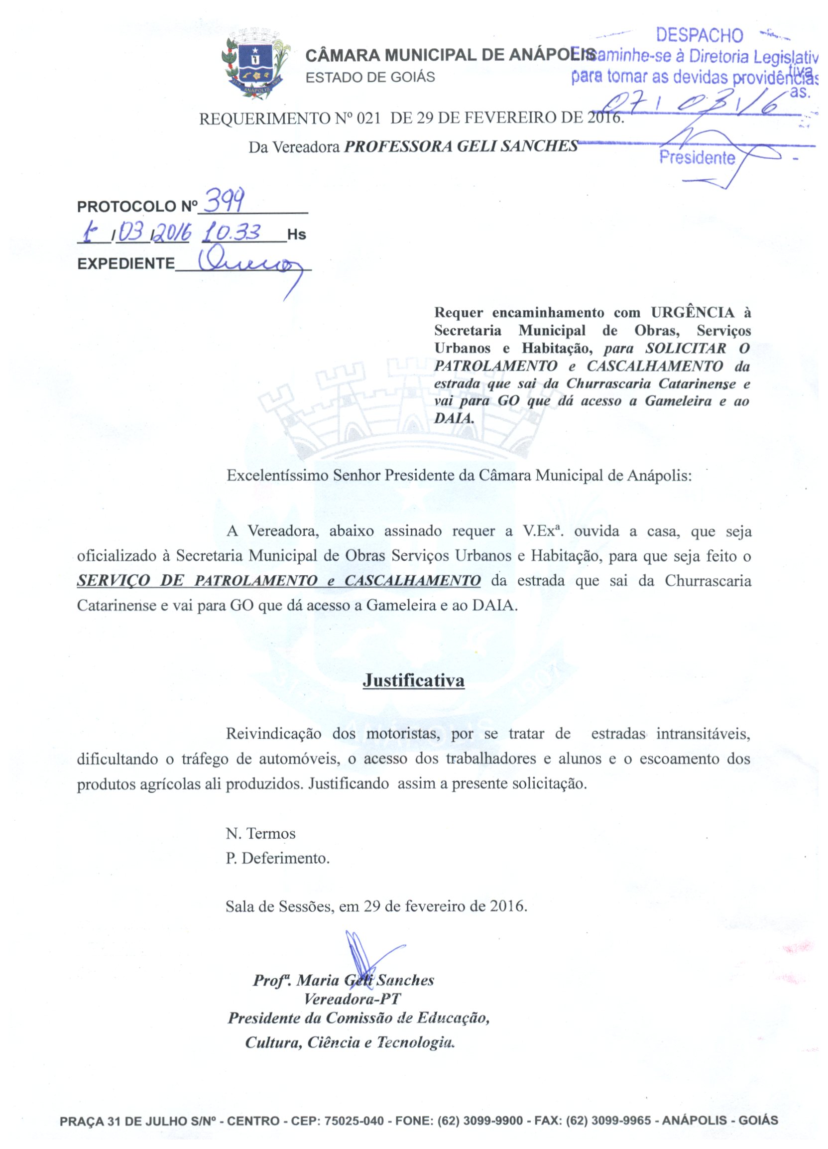 Ementa: À SECRETARIA MUNICIPAL DO MEIO AMBIENTE, SOLICITANDO O SERVIÇO DE PATROLAMENTO E CASCALHAMENTO DA ESTRADA QUE SAI DA CHURRASCARIA CATARINENSE E VAI PARA GO QUE DÁ ACESSO A GAMELEIRA E AO DAIA.