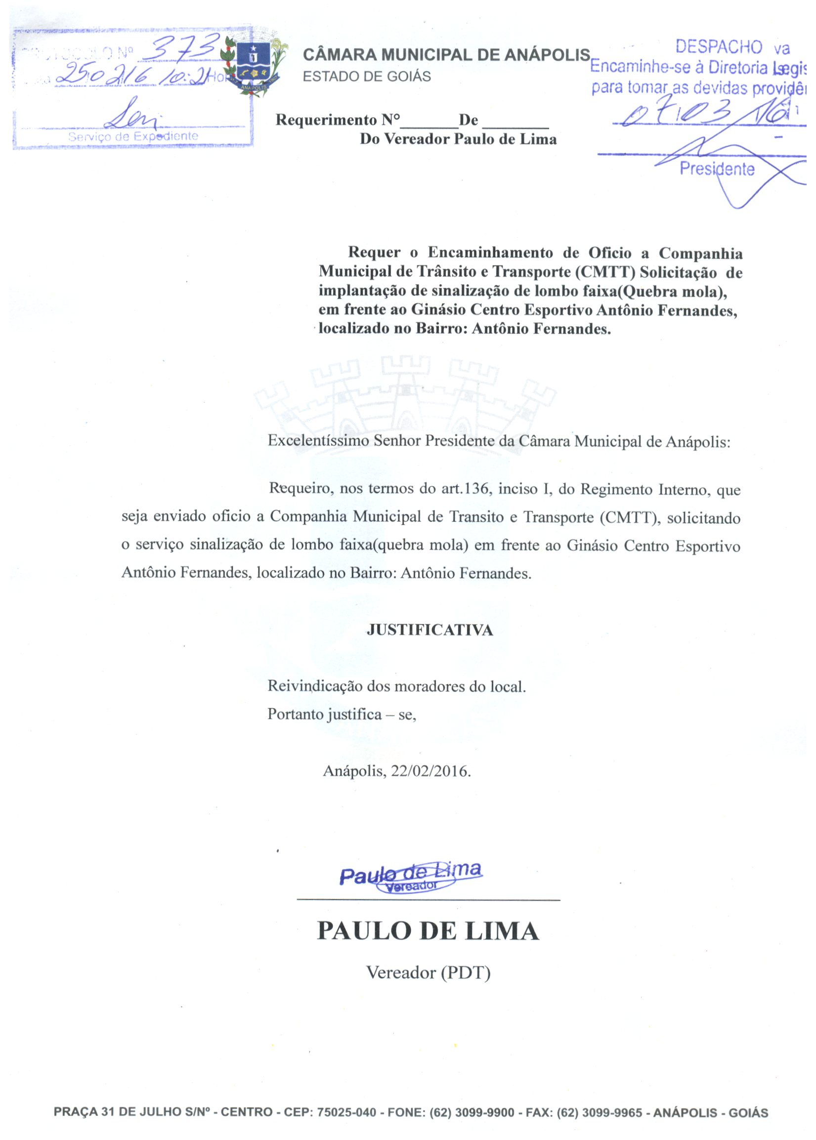 Ementa: À CMTT SOLICITA A IMPLANTAÇÃO DE SINALIZAÇÃO DE LOMBO DE FAIXA EM FRENTE AO GINÁSIO CENTRO ESPORTIVO ANTÔNIO FERNANDES.