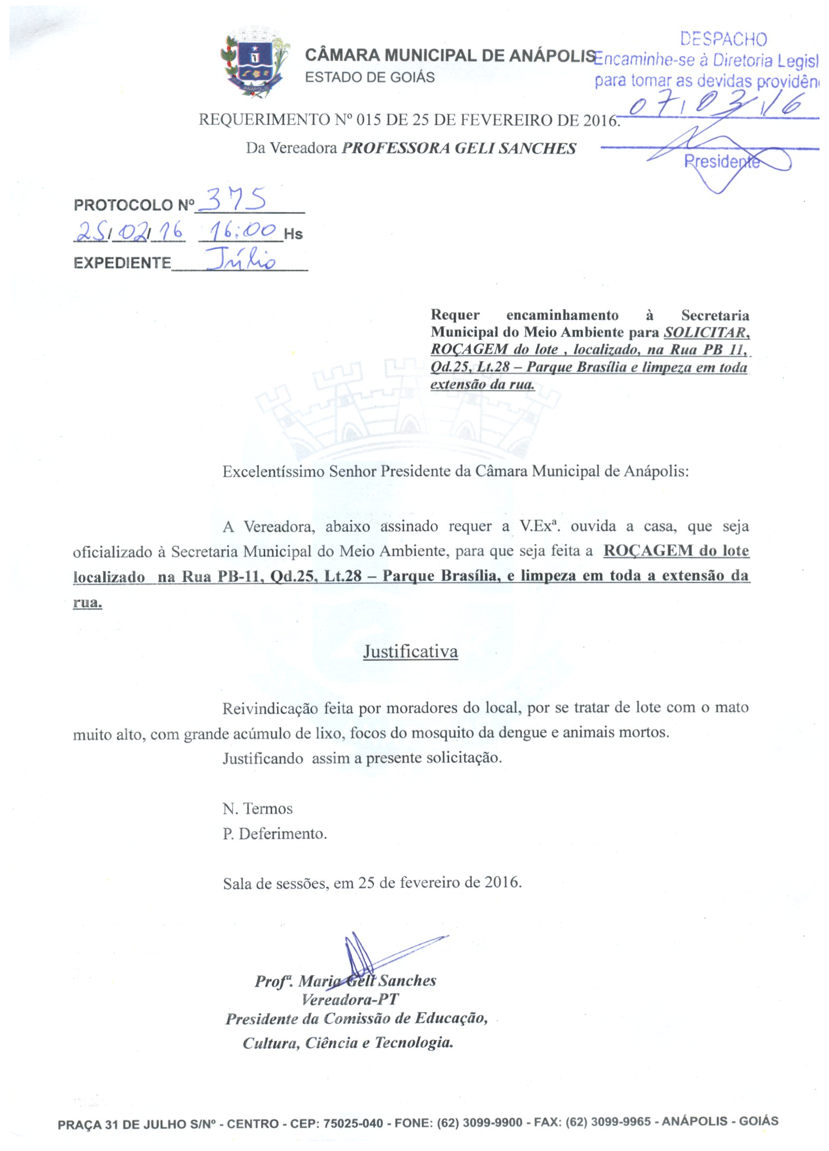 Ementa: À SECRETARIA MUNICIPAL DE MEIO AMBIENTE, REQUER SERVIÇO DE LIMPEZA E ROÇAGEM NA RUA BRASÍLIA 7 QD 07, AO LADO DO COLÉGIO OSWALDO FRANCISCO.