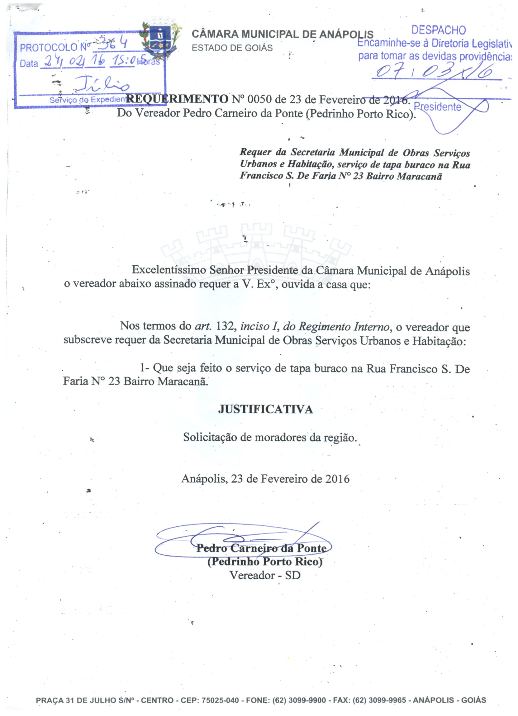Ementa: À SECRETARIA MUNICIPAL DE OBRAS E SERVIÇOS URBANOS E HABITAÇÃO, REQUER SERVIÇO DE TAPA BURACO DA RUA FRANCISCO S. DE FARIA Nº 23.