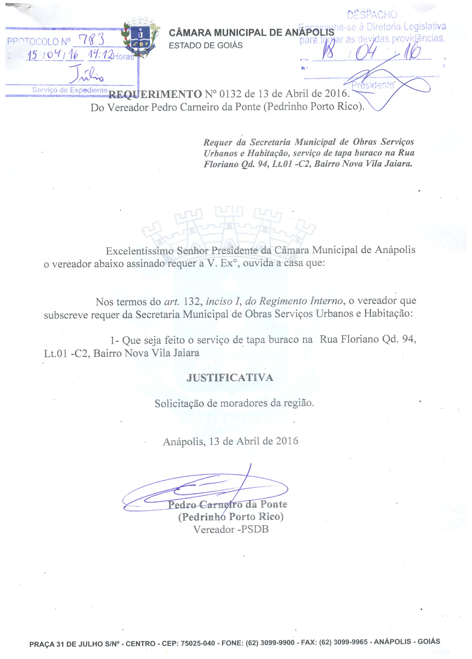 Ementa: REQUER À SECRETARIA MUNICIPAL DE OBRAS, SERVIÇOS URBANOS E HABITAÇÃO, SOLICITANDO SERVIÇOS DE TAPA BURACOS NA RUA FLORIANO QD. 94 LT 01-C2