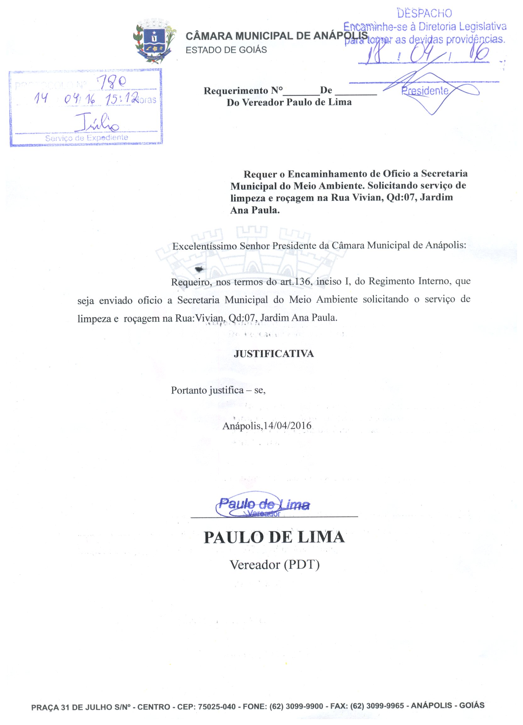 Ementa: REQUER À SECRETARIA MUNICIPAL DE MEIO AMBIENTE, SOLICITANDO SERVIÇOS DE LIMPEZA E ROÇAGEM NA RUA VIVIAN QD 07.