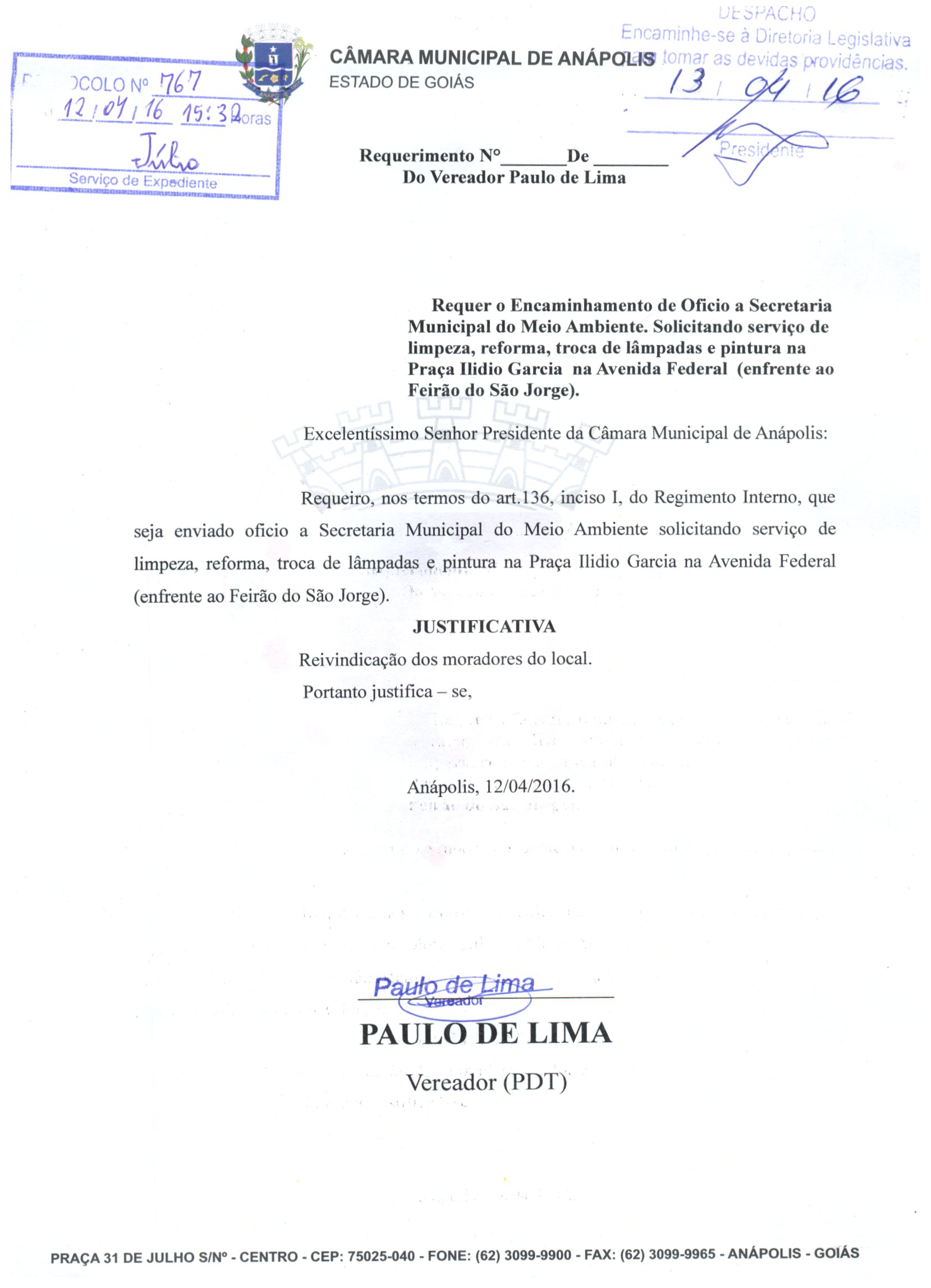 Ementa: À SECRETARIA MUNICIPAL DE MEIO AMBIENTE SOLICITANDO SERVIÇO DE LIMPEZA, REFORMA, TROCA DE LÂMPADA E PINTURA NA PRAÇA ILIDIO GARCIA NA AV. FEDERAL.