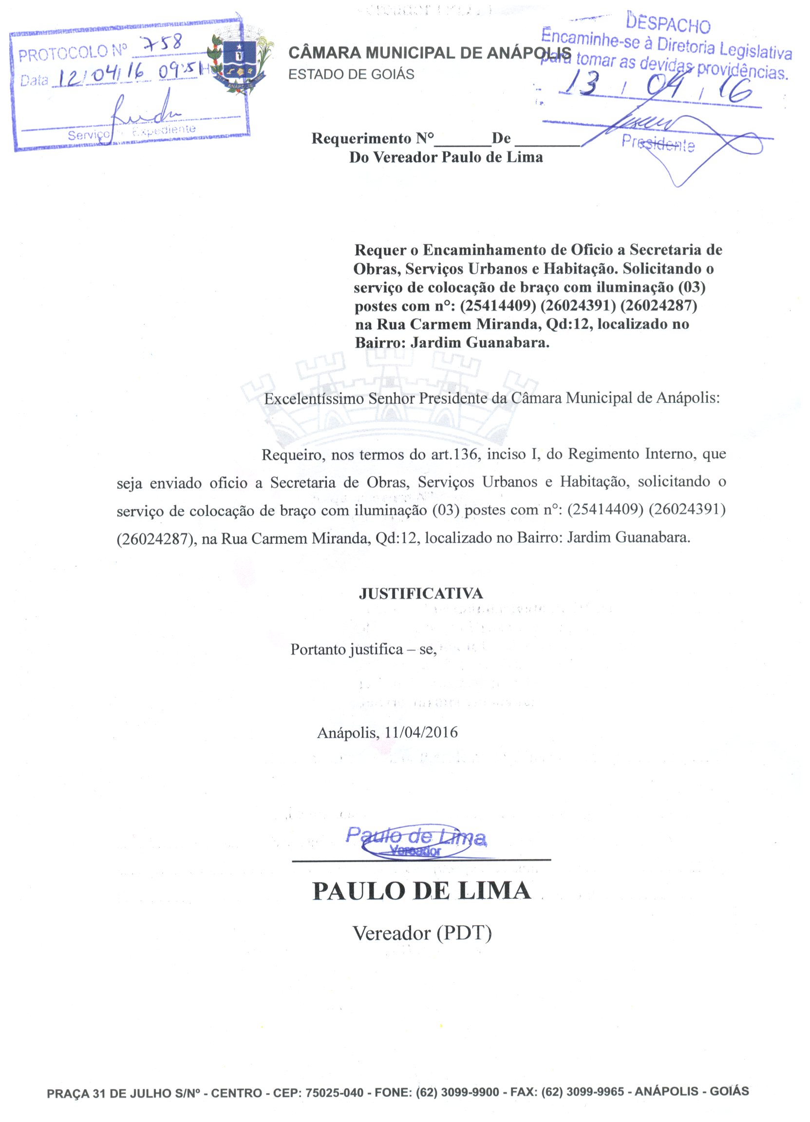 Ementa: À SECRETARIA MUNICIPAL DE OBRAS, SERVIÇOS URBANOS E HABITAÇÃO, SOLICITANDO SERVIÇO DE COLOCAÇÃO DE BRAÇO COM ILUMINAÇÃO (03) POSTES COM O Nº 25414409 / 26024391 / 26024287, NA RUA CARMEM MIRANDA QD 12
