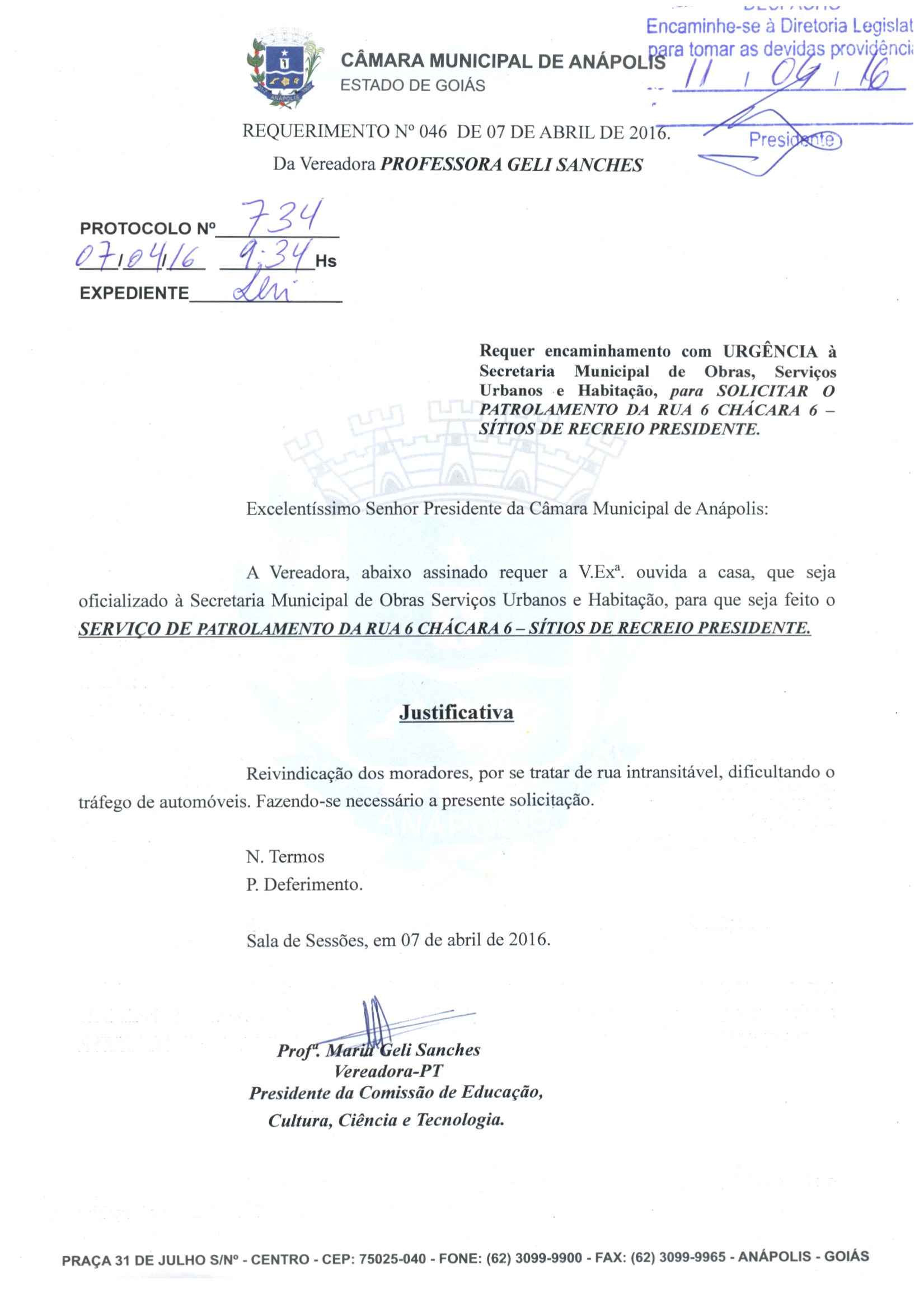 Ementa: À SECRETARIA DE OBRAS, SERVIÇOS URBANOS E HABITAÇÃO SOLICITANDO O PATROLAMENTO DA RUA 06.