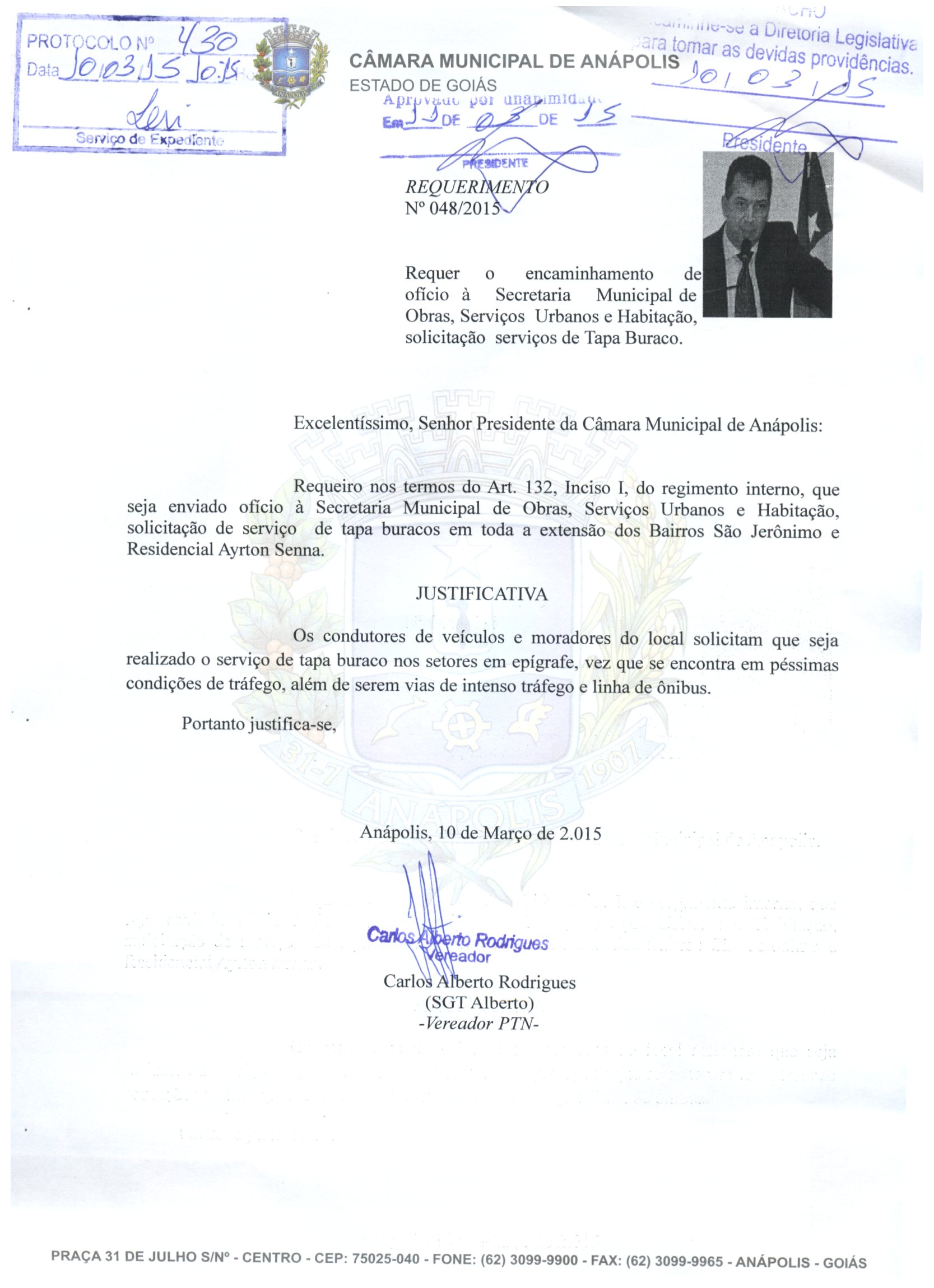 Ementa: REQUEIRO NOS TERMOS DO ART. 132, INCISO I, DO REGIMENTO INTERNO, QUE SEJA ENVIADO OFÍCIO À SECRETARIA MUNICIPAL DE OBRAS, SERVIÇOS URBANOS E HABITAÇÃO, SOLICITAÇÃO DE SERVIÇO DE TAPA BURACOS EM TODA A EXTENSÃO DOS BAIRROS SÃO JERÔNIMO E RESIDENCIAL AYRTON SENNA.