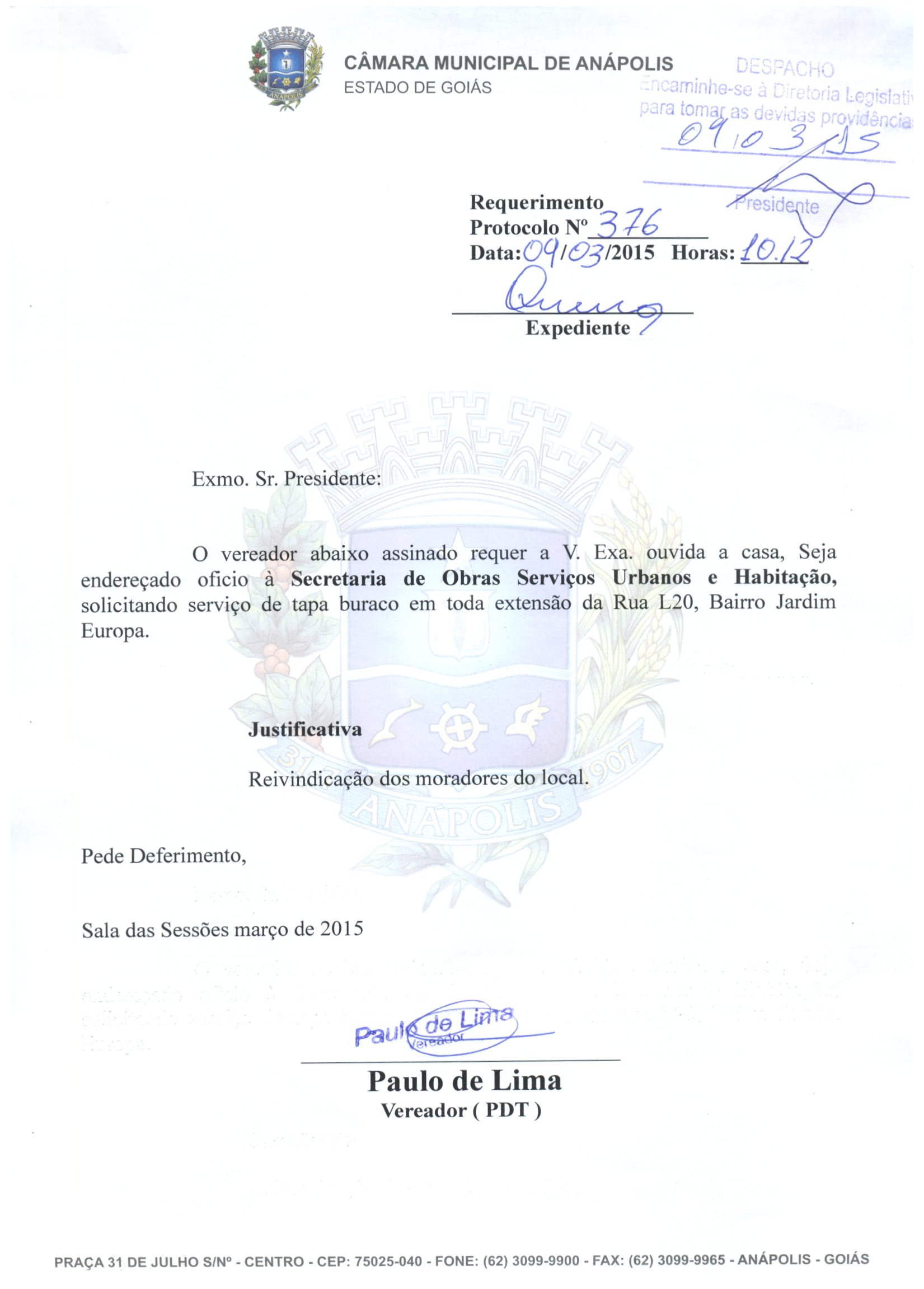 Ementa: O VEREADOR ABAIXO ASSINADO REQUER A V. EXA. OUVIDA A CASA, SEJA ENDEREÇADO OFÍCIO À SECRETARIA DE OBRAS SERVIÇOS URBANOS E HABITAÇÃO, SOLICITANDO SERVIÇO DE TAPA BURACO EM TODA EXTENSÃO DA RUA L20, BAIRRO JARDIM EUROPA.