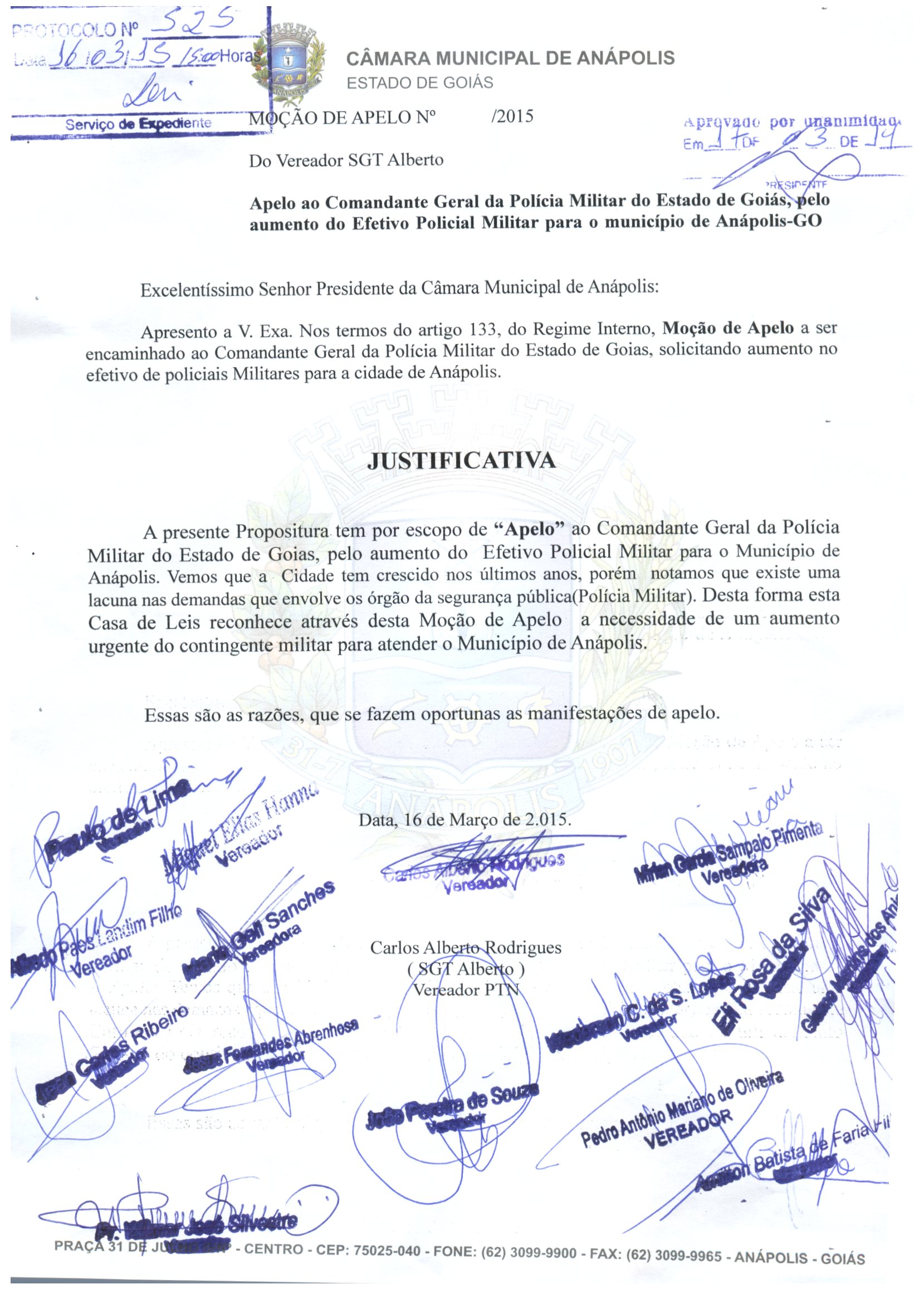 Ementa: APRESENTO A V. EXA. NOS TERMOS DO ARTIGO 133, DO REGIME INTERNO, MOÇÃO DE APELO A SER ENCAMINHADO AO COMANDANTE GERAL DA POLÍCIA MILITAR DO ESTADO DE GOIÁS, SOLICITANDO AUMENTO NO EFETIVO DE POLICIAIS MILITARES PARA A CIDADE DE ANÁPOLIS.