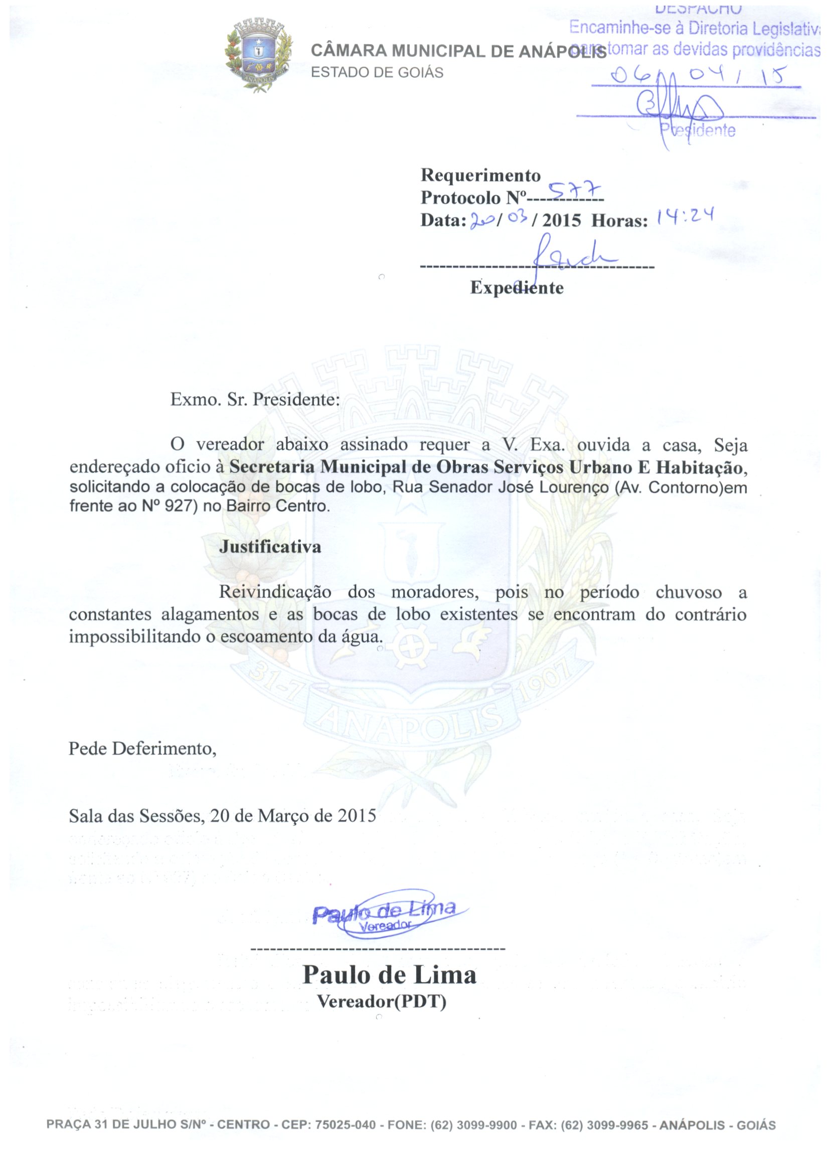 Ementa: O VEREADOR ABAIXO ASSINADO REQUER A V. EXA. OUVIDA A CASA, SEJA ENDEREÇADO OFÍCIO À SECRETARIA MUNICIPAL DE OBRAS SERVIÇOS URBANOS E HABITAÇÃO, SOLICITANDO A COLOCAÇÃO DE BOCAS DE LOBO, RUA SENADOR JOSÉ LOURENÇO (AV. CONTORNO) EM FRENTE AO N° 927 NO BAIRRO CENTRO.