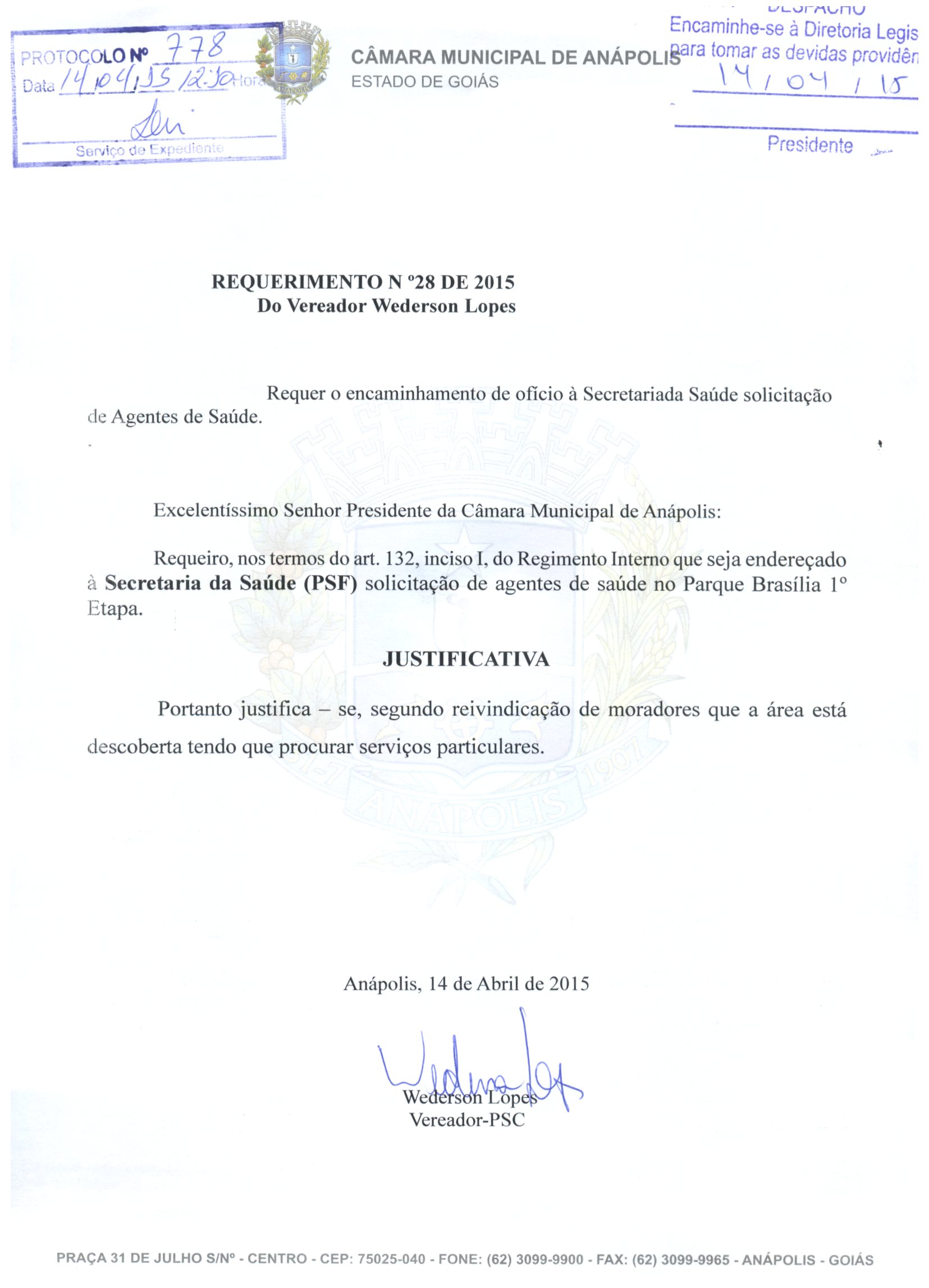Ementa: REQUEIRO, NOS TERMOS DO ART. 132, INCISO I, DO REGIMENTO INTERNO QUE SEJA ENDEREÇADO À SECRETARIA DA SAÚDE (PSF) SOLICITAÇÃO DE UM POSTO DE SAÚDE NO PARQUE BRASÍLIA.
