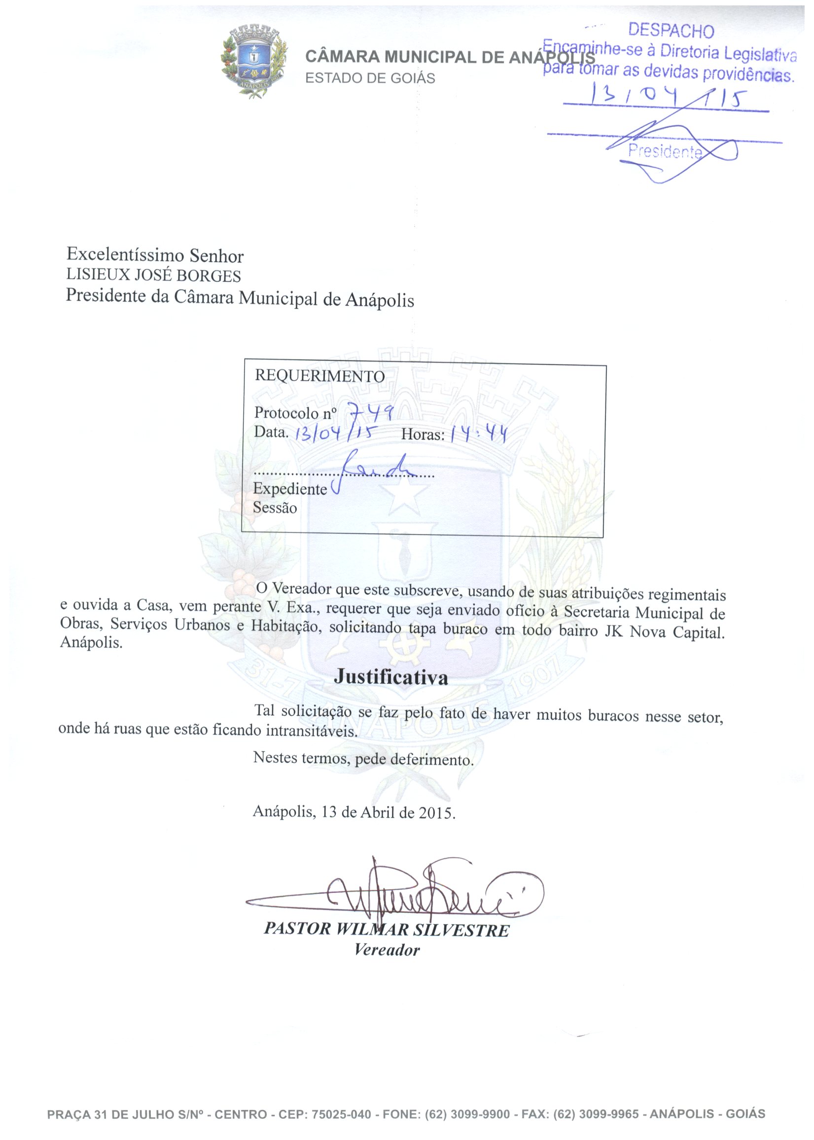 Ementa: O VEREADOR QUE ESTE SUBSCREVE, USANDO DE SUAS ATRIBUIÇÕES REGIMENTAIS E OUVIDA A CASA, VEM PERANTE V. EXA., REQUERER QUE SEJA ENVIADO OFÍCIO À SECRETARIA MUNICIPAL DE OBRAS, SERVIÇOS URBANOS E HABITAÇÃO, SOLICITANDO TAPA BURACO NA RUA X4 EM FRENTE A QUADRA 4 BAIRRO VIVIAN PARQUE. ANÁPOLIS.