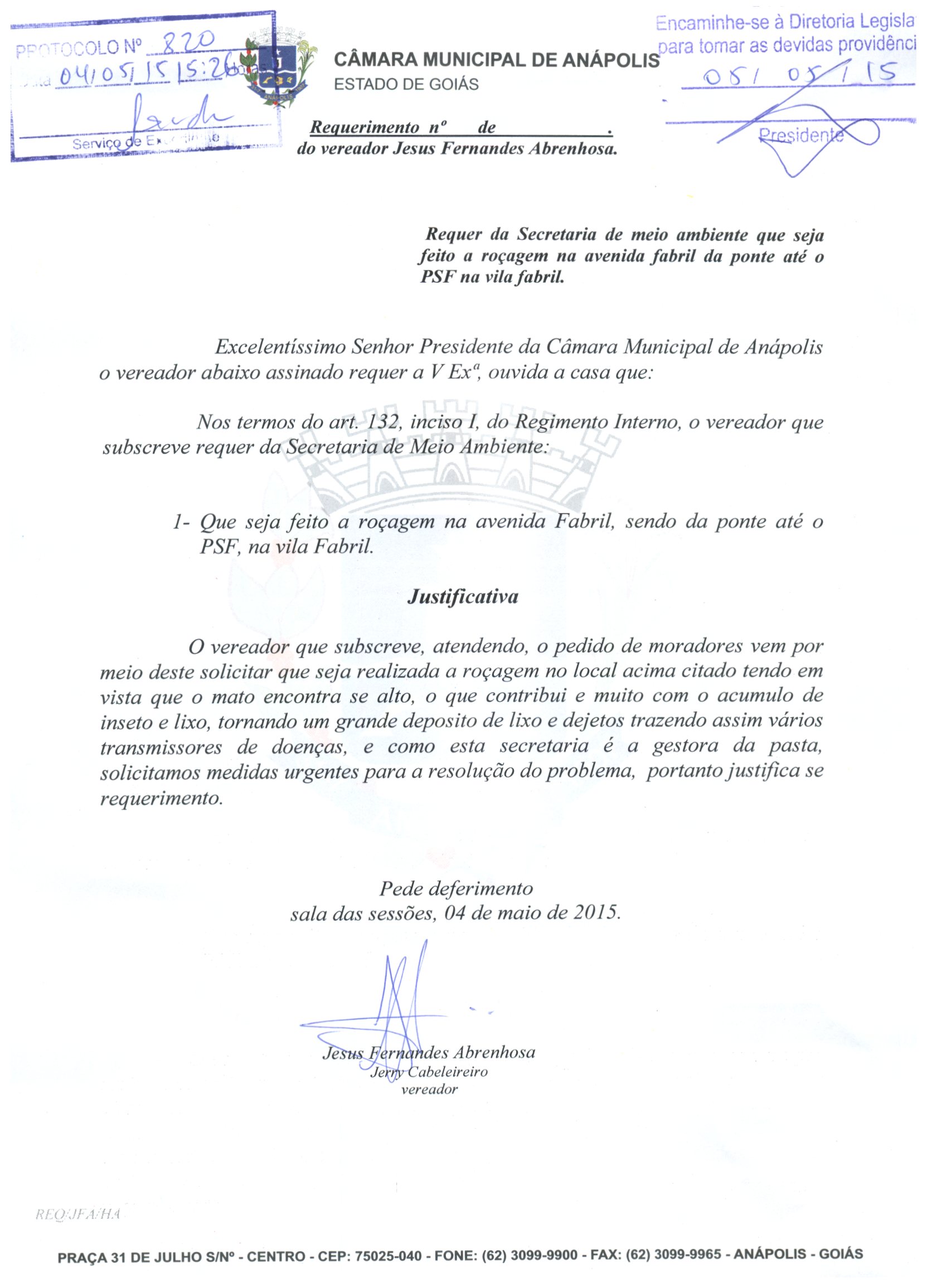 Ementa: O VEREADOR ABAIXO ASSINADO REQUER À V. EXª OUVIDA A CASA, QUE SEJA ENVIADO À MESA DIRETORA DESTA CASA DE LEIS PARA QUE FORME UMA COMITIVA COM OS NOBRES PARES EM IDA AO EXMO. SR. PREFEITO JOÃO GOMES NO SENTIDO DE COLOCAR À DISPOSIÇÃO TODOS OS MAQUINÁRIOS E MÃO DE OBRAS DE TODAS AS SECRETARIAS E DIRETORIAS A FIM DE REALIZAR SERVIÇOS DE ROÇAGEM E LIMPEZA EM TERRENOS BALDIOS, CALÇADAS, BEM COMO SERVIÇOS DE TAPA-BURACOS NAS RUAS DO MUNICÍPIO DE ANÁPOLIS.