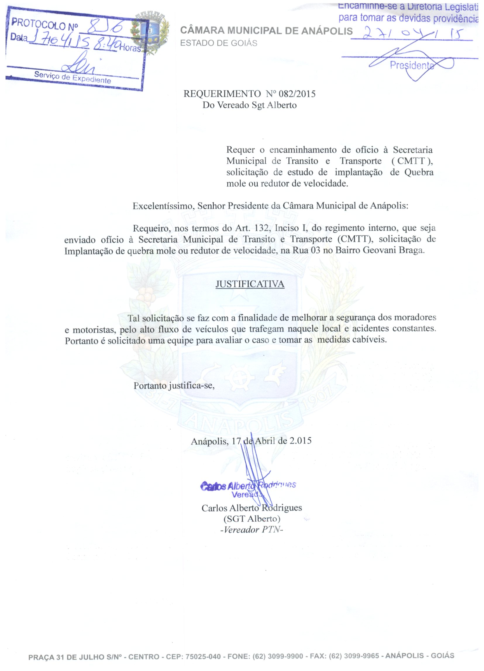 Ementa: REQUEIRO, NOS TERMOS DO ART. 132, INCISO I, DO REGIMENTO INTERNO, QUE SEJA ENVIADO OFICIO A SECRETARIA MUNICIPAL DE TRÂNSITO E TRANSPORTE (CMTT), SOLICITAÇÃO DE IMPLANTAÇÃO DE QUEBRA MOLA OU REDUTOR DE VELOCIDADE, NA RUA 03 NO BAIRRO GEOVANNI BRAGA.