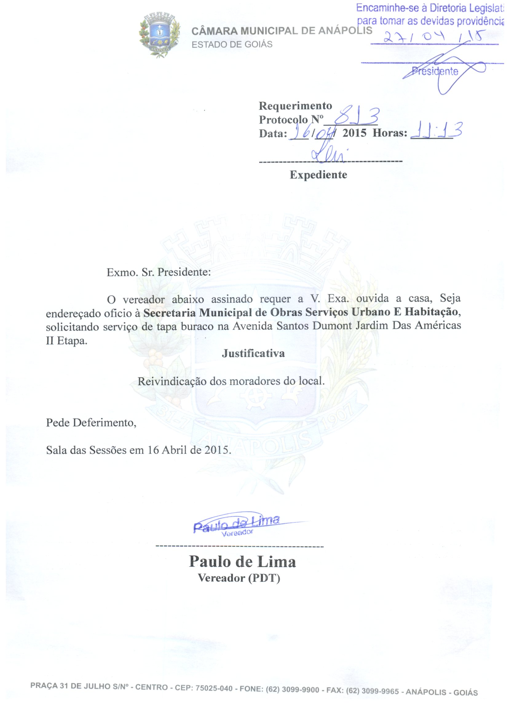 Ementa: O VEREADOR ABAIXO ASSINADO REQUER A V. EXA. OUVIDA A CASA, SEJA ENDEREÇADO OFÍCIO À SECRETARIA MUNICIPAL DE OBRAS SERVIÇOS URBANOS E HABITAÇÃO, SOLICITANDO SERVIÇO DE TAPA BURACO NA AVENIDA SANTOS DUMONT JARDIM DAS AMÉRICAS II ETAPA.