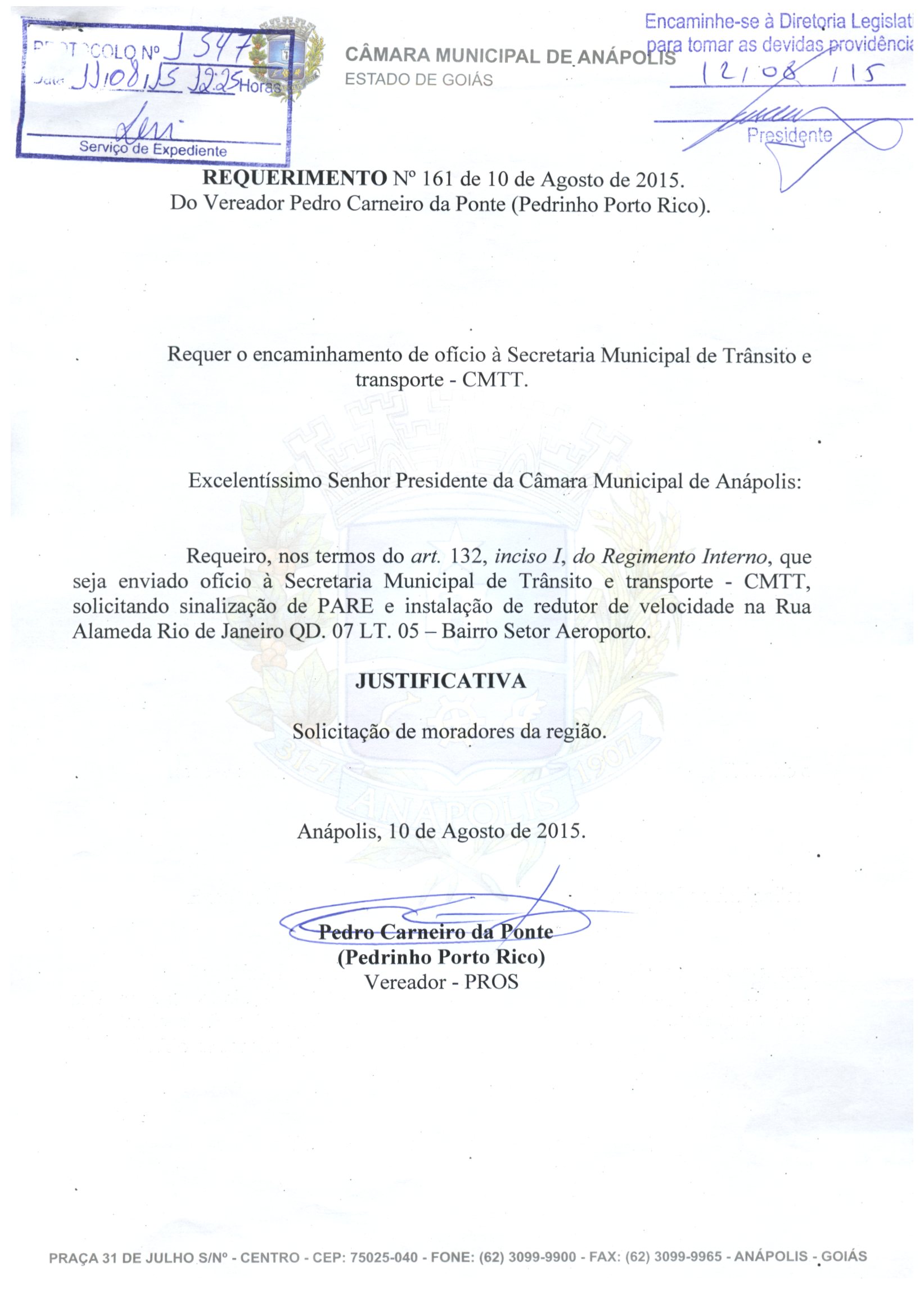 Ementa: AO CMTT- SECRETARIA MUNICIPAL DE TRÂNSITO E TRANSPORTE, SOLICITANDO SINALIZAÇÃO DE PARE E INSTALAÇÃO DE REDUTOR DE VELOCIDADE NA RUA ALAMEDA RIO DE JANEIRO QD. 07 LT. 05 -B. SETOR AEROPORTO