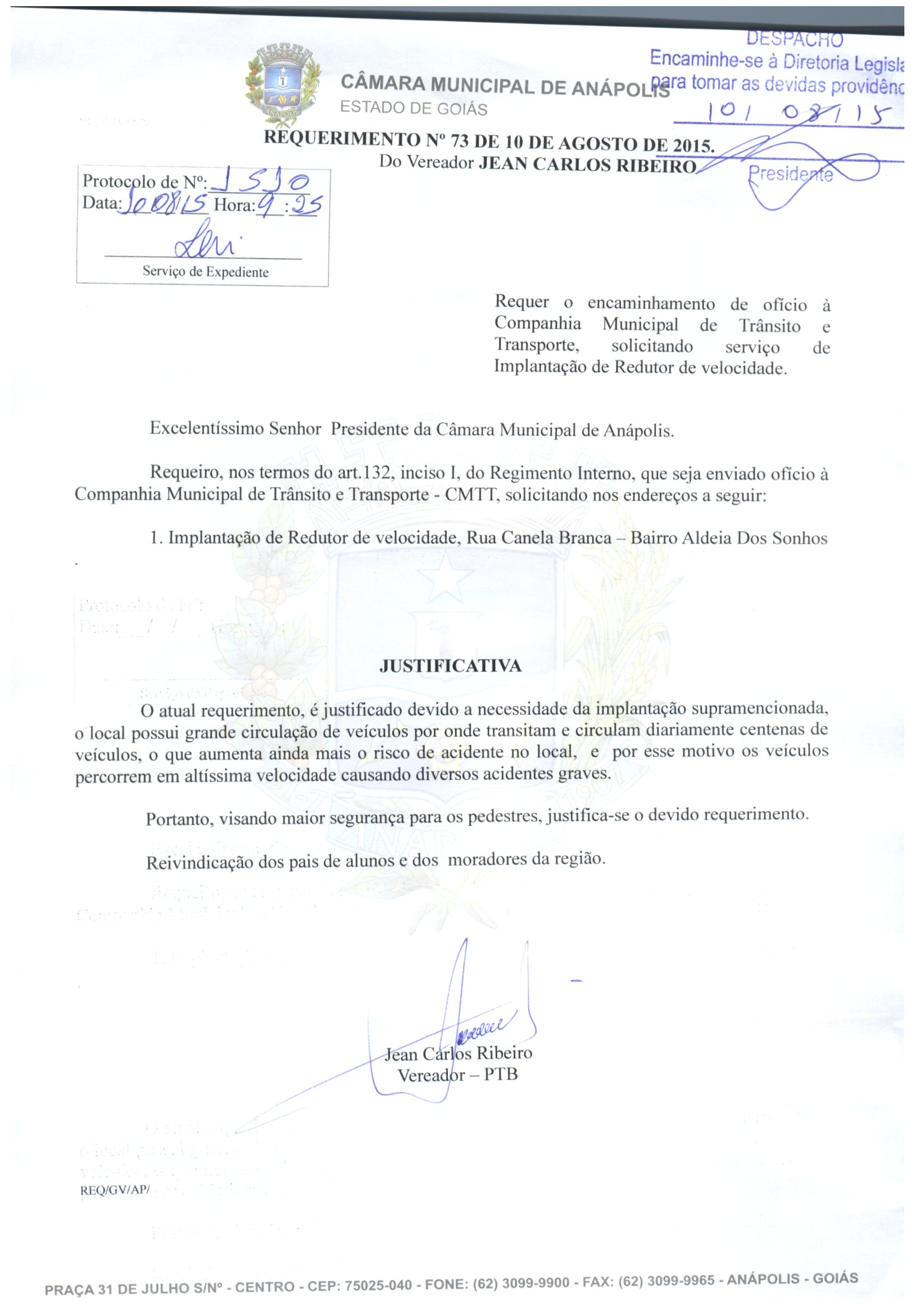 Ementa: À COMPANHIA MUNICIPAL DE TRÂNSITO E TRANSPORTE CMTT, SOLICITANDO NOS ENDEREÇOS A SEGUIR: IMPLANTAÇÃO DE REDUTOR DE VELOCIDADE, RUA CANELA BRANCA - BAIRRO ALDEIA DOS SONHOS.