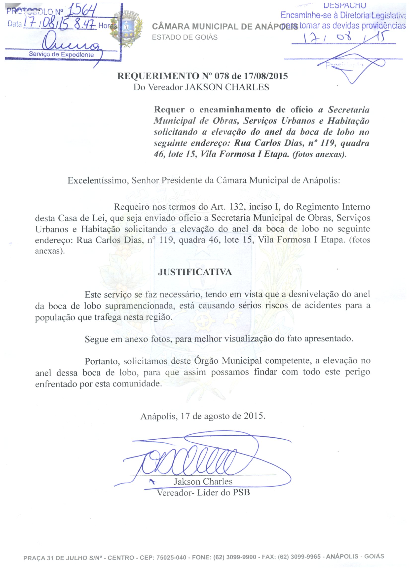 Ementa: À SECRETARIA MUNICIPAL DE OBRAS, SERVIÇOS URBANOS E HABITAÇÃO, SOLICITANDO A ELEVAÇÃO DO ANEL DA BOCA DE LOBO NO SEGUINTE ENDEREÇO: RUA CARLOS DIAS, Nº 119, QUADRA 46, LOTE 15, VILA FORMOSA I ETAPA.