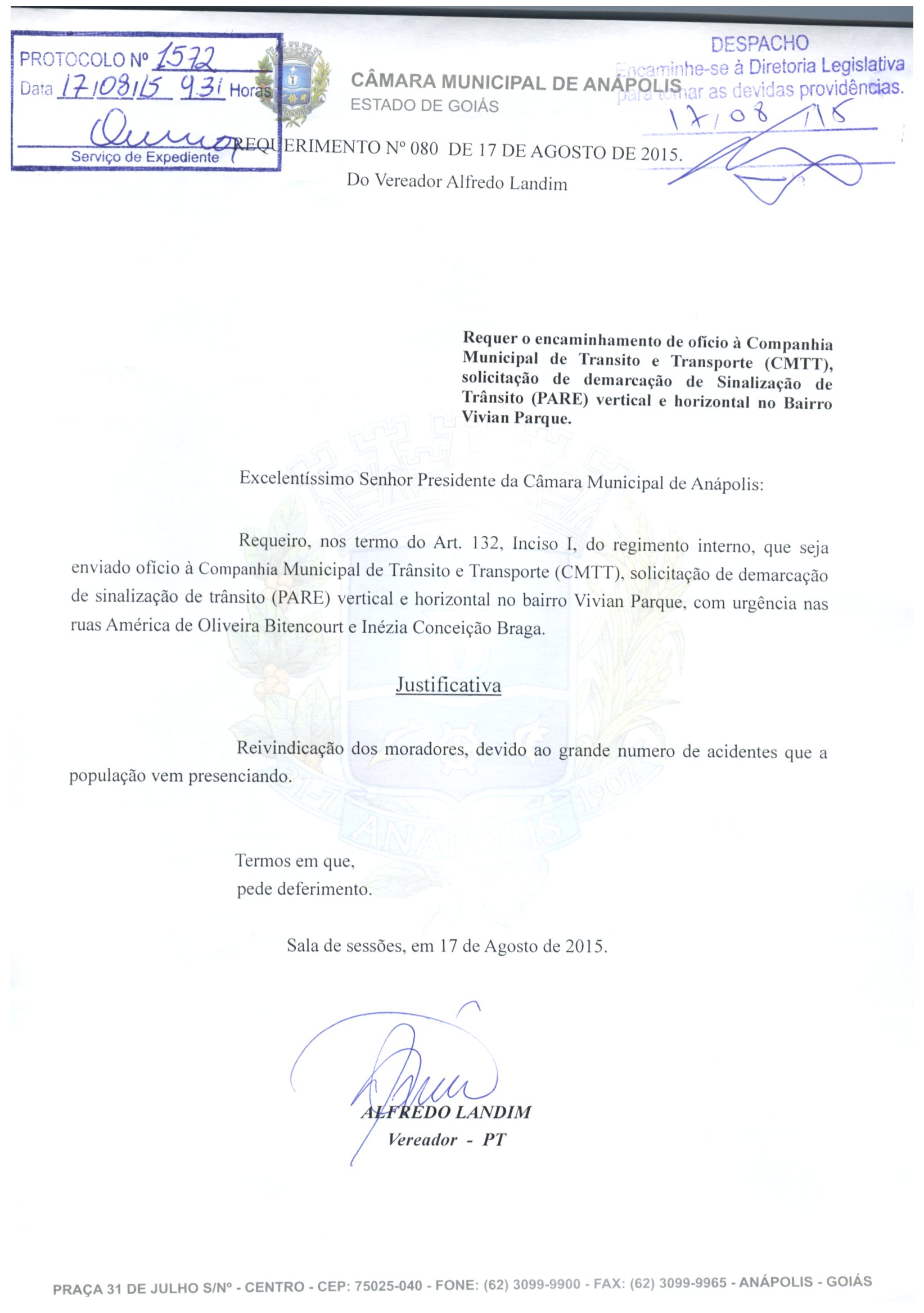 Ementa: À COMPANHIA MUNICIPAL DE TRÂNSITO E TRANSPORTE - CMTT, SOLICITANDO: DEMARCAÇÃO DE SINALIZAÇÃO DE TRÂNSITO (PARE) VERTICAL E HORIZONTAL NO BAIRRO VIVIAN PARQUE, COM URGÊNCIA NAS RUAS AMÉRICA DE OLIVEIRA BITENCOURT E INÉZIA CONCEIÇÃO BRAGA.
