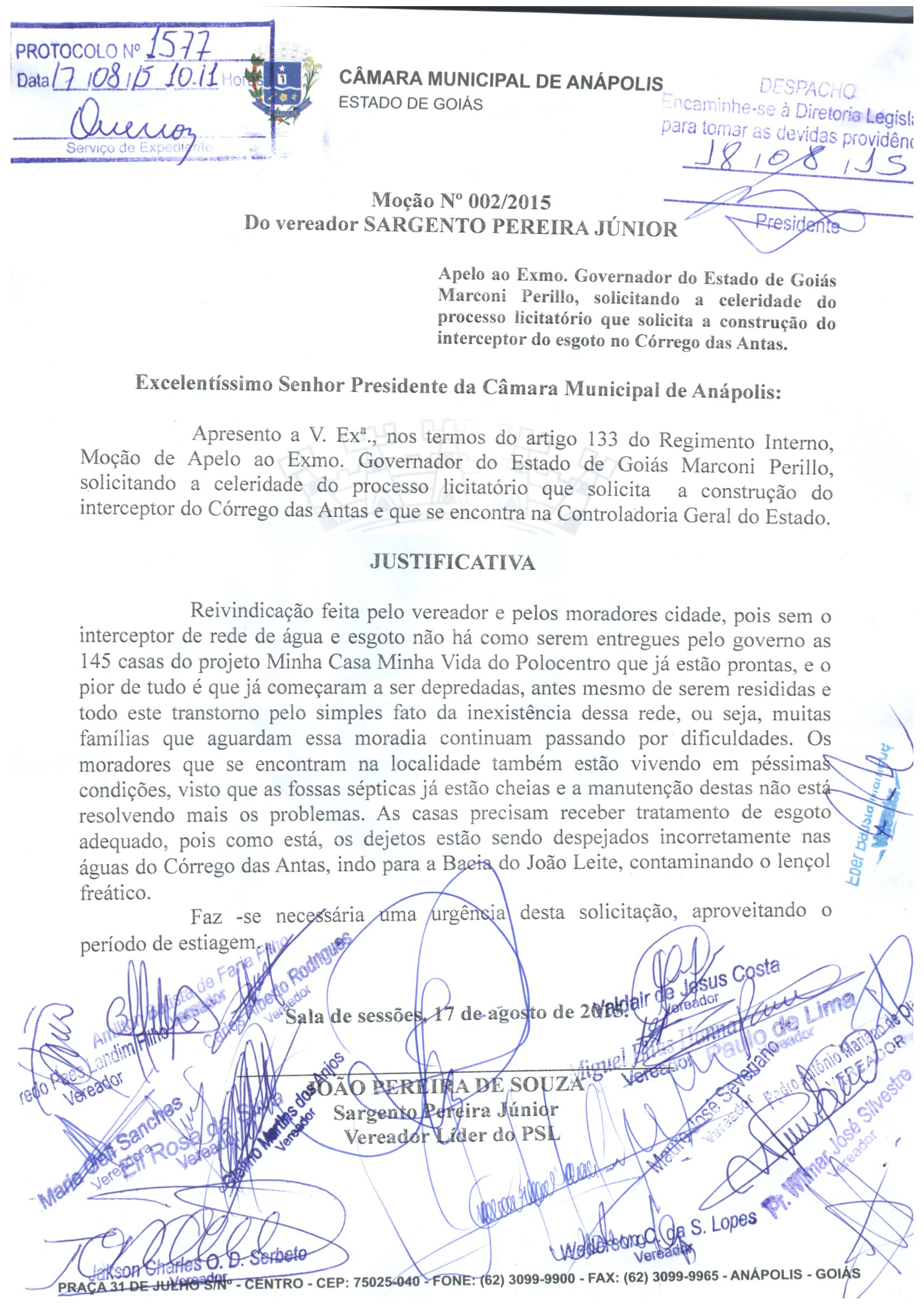 Ementa: AO EXMO. GOVERNADOR DO ESTADO DE GOIÁS MARCONI PERILLO, SOLICITANDO A CELERIDADE DO PROCESSO LICITATÓRIO QUE SOLICITA A CONSTRUÇÃO DO INTERCEPTOR DO CÓRREGO DAS ANTAS E QUE SE ENCONTRA NA CONTROLADORIA GERAL DO ESTADO.