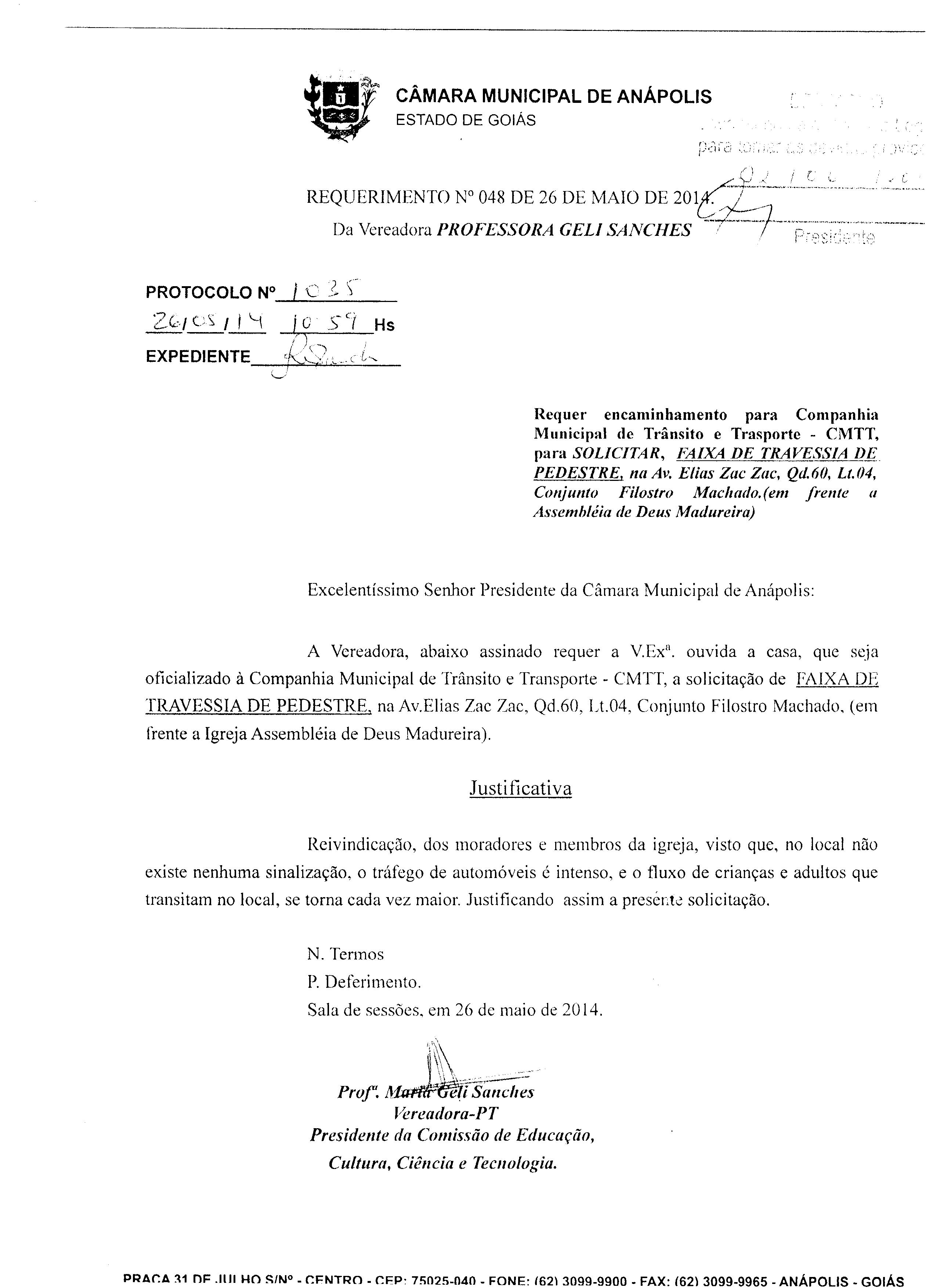Ementa: À COMPANHIA MUNICIPAL DE TRÂNSITO E TRANSPORTE-CMTT, A SOLICITAÇÃO DE FAIXA DE TRAVESSIA DE PEDESTRE, NA AV. ELIAS ZAC ZAC, QD.60, LT. 04, CONJUNTO FILOSTROFO MACHADO, (EM FRENTE A IGREJA ASSEMBLÉIA DE DEUS MADUREIRA).