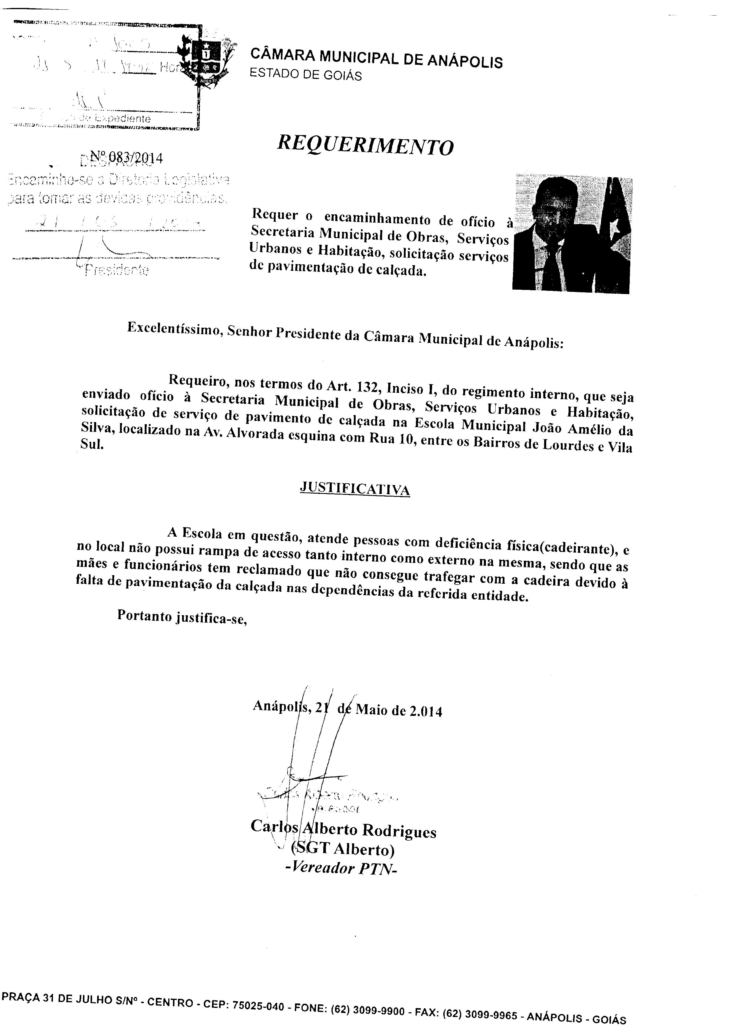 Ementa: À SECRETARIA MUNICIPAL DE OBRAS, SERVIÇOS URBANOS E HABITAÇÃO, SOLICITAÇÃO DE SERVIÇO DE PAVIMENTO DE CALÇADA NA ESCOLA MUNICIPAL JOÃO AMÉLIO DA SILVA, LOCALIZADO NA AV. ALVORADA ESQUINA COM RUA 10, ENTRE OS BAIRROS DE LOURDES E VILA SUL.