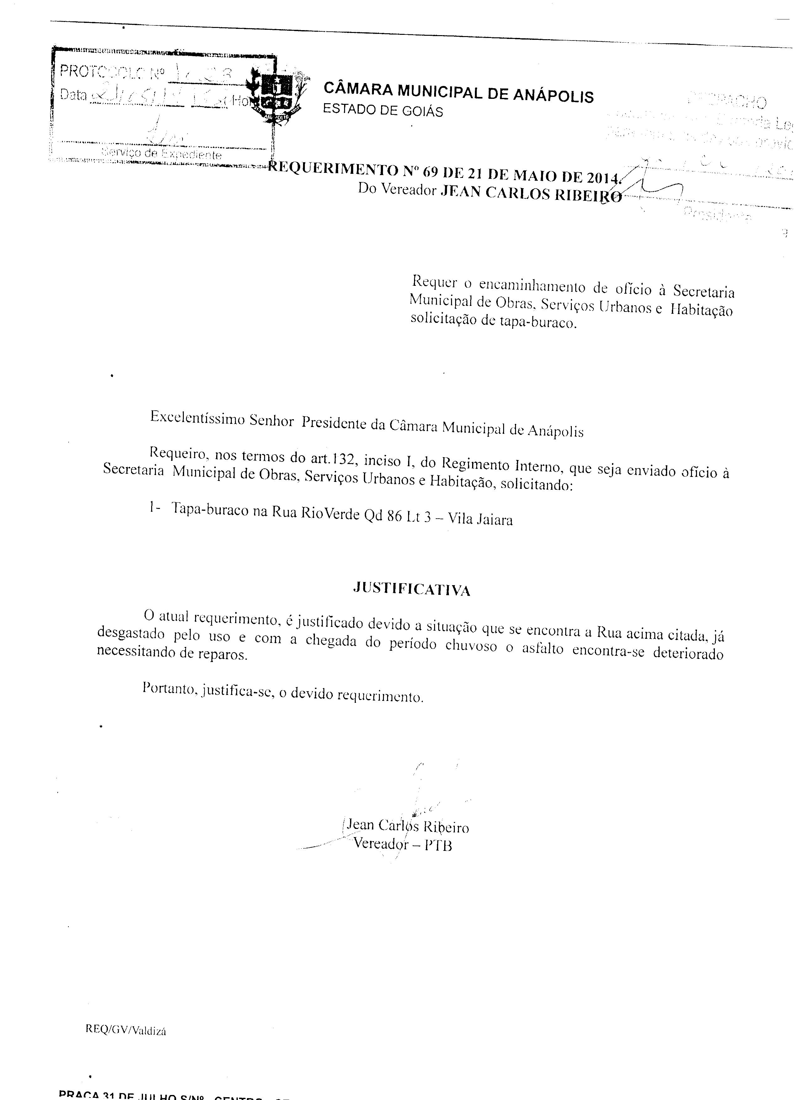 Ementa: À SECRETARIA MUNICIPAL DE OBRAS, SERVIÇOS URBANOS E HABITAÇÃO, SOLICITANDO: TAPA BURACO NA RUA RIO VERDE, QD 86, LT 3 - VILA JAIARA.