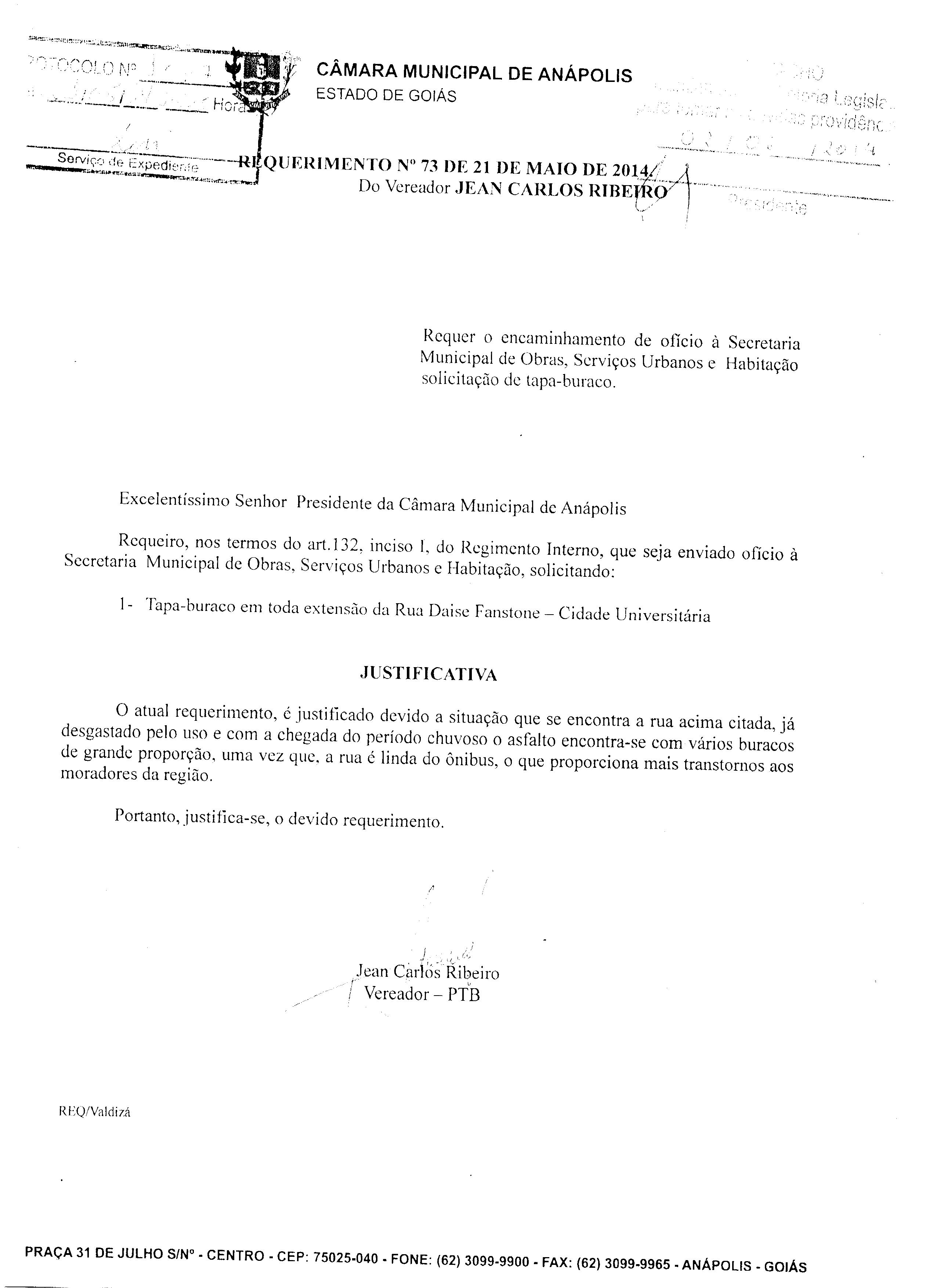 Ementa: À SECRETARIA MUNICIPAL DE OBRAS, SERVIÇOS URBANOS E HABITAÇÃO, SOLICITANDO: TAPA- BURACO EM TODA EXTENSÃO DA RUA DAISE FANSTONE- CIDADE UNIVERSITÁRIA.