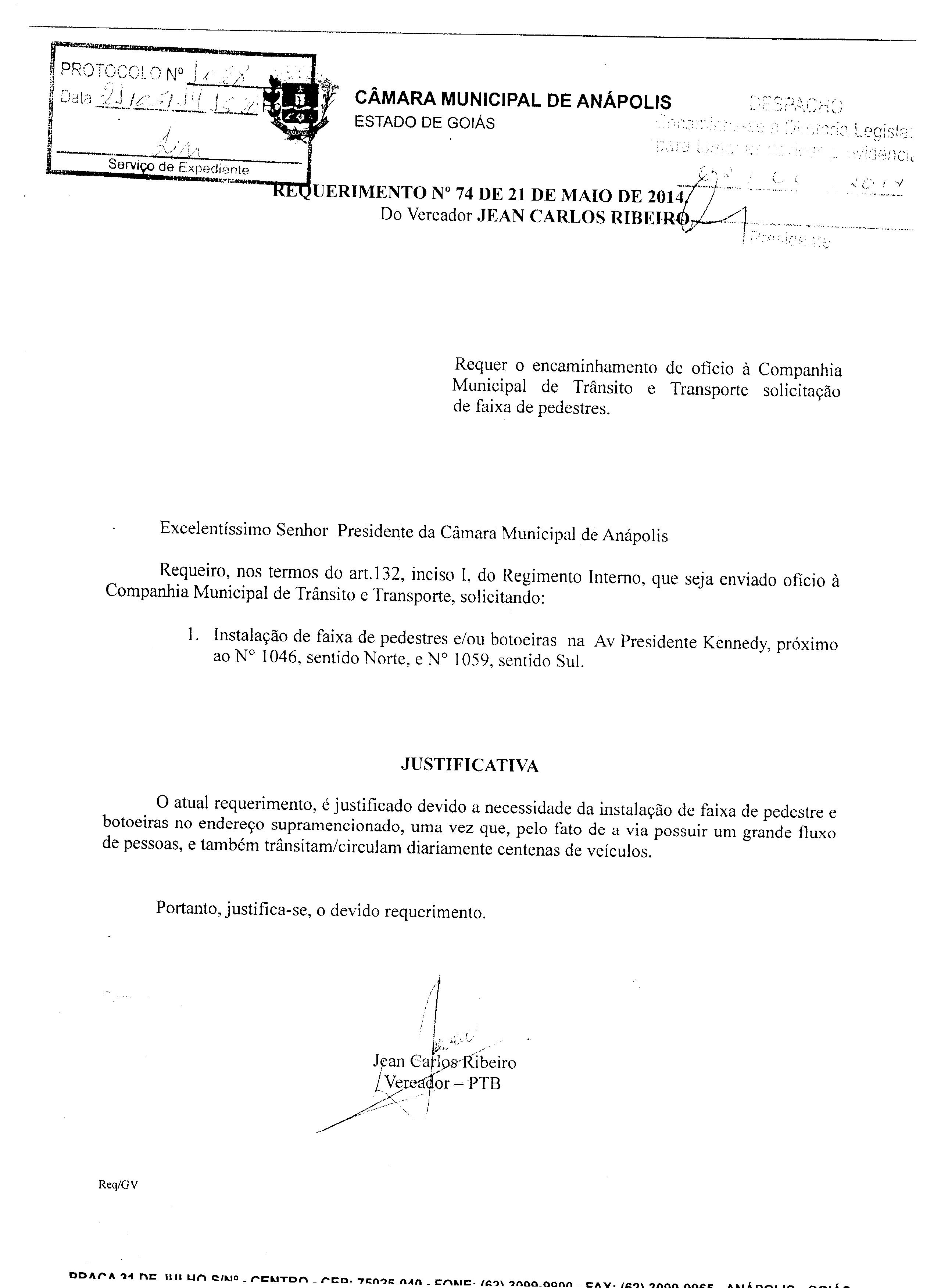 Ementa: À SECRETARIA MUNICIPAL DE TRÂNSITO E TRANSPORTE, SOLICITANDO: INSTALAÇÃO DE FAIXA DE PEDESTRE E/OU BOTOEIRAS NA AV. PRESIDENTE KENNEDY, PRÓXIMO AO N° 1046, SENTIDO NORTE, E N° 1059, SENTIDO SUL.