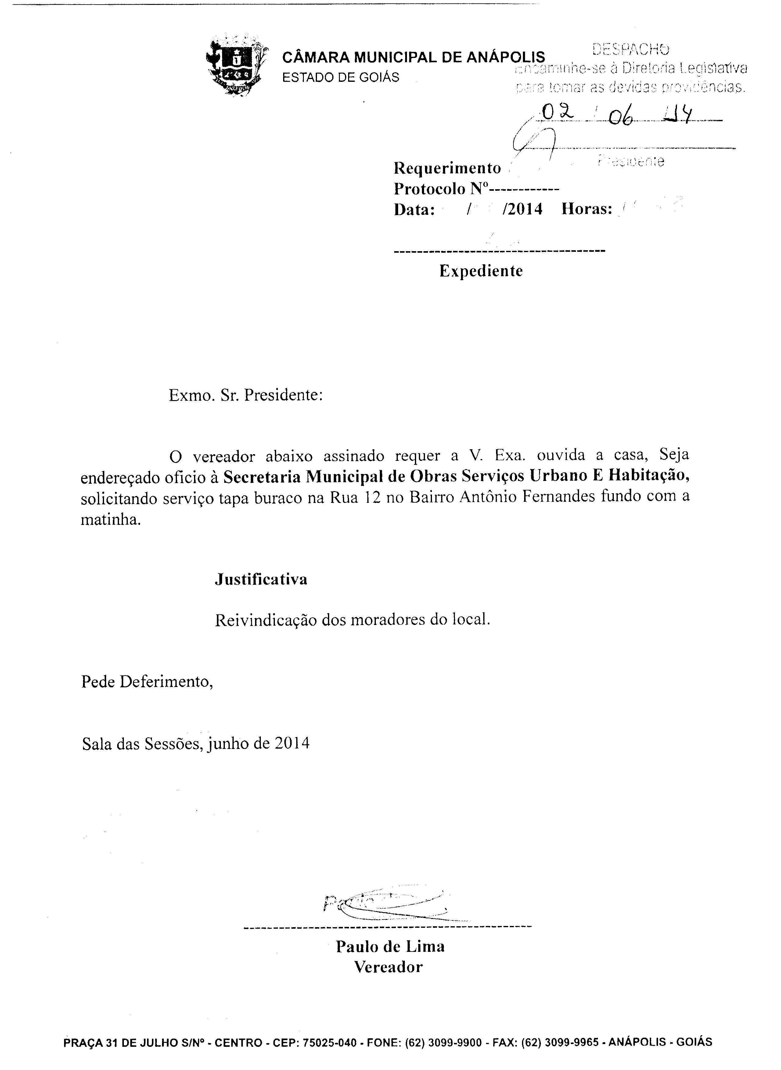 Ementa: À SECRETARIA MUNICIPAL DE OBRAS, SERVIÇOS URBANOS E HABITAÇÃO; SOLICITANDO O SERVIÇO DE TAPA BURACOS NA RUA 12 NO BAIRRO ANTÔNIO FERNANDES FUNDO COM A MATINHA.