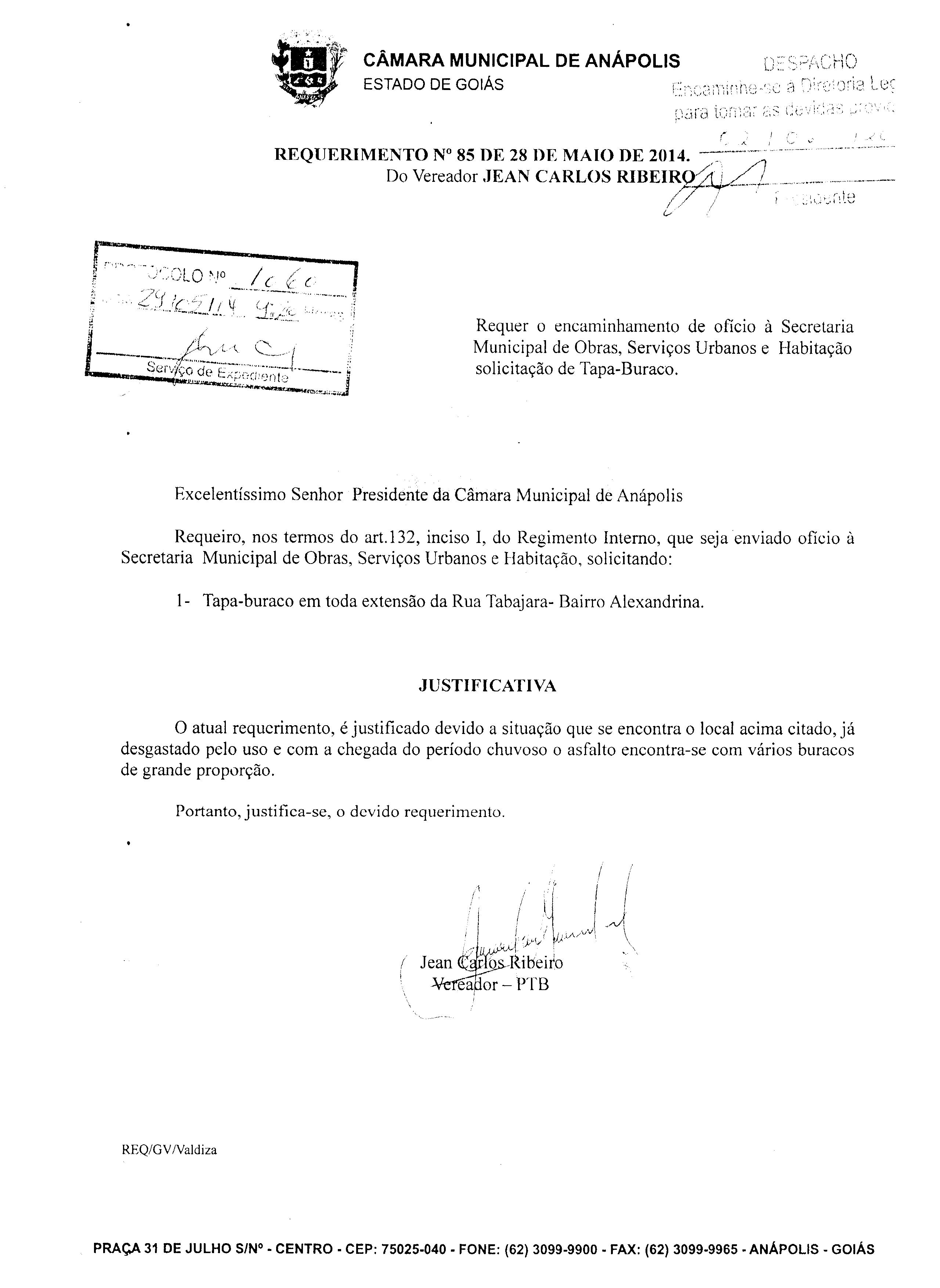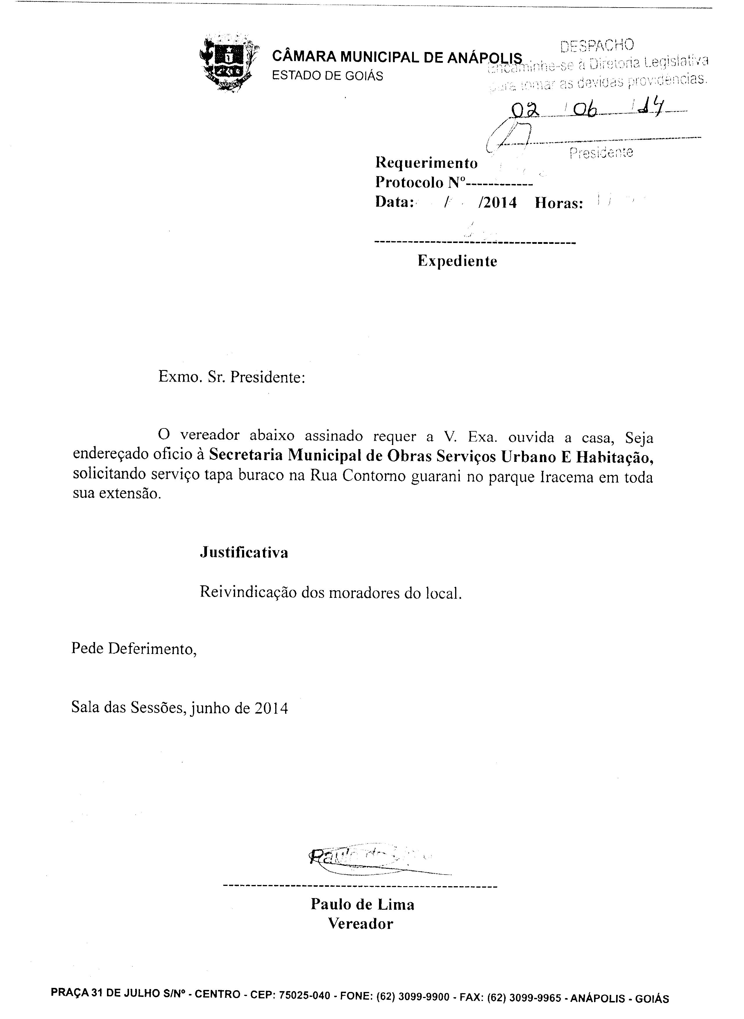Ementa: À SECRETARIA MUNICIPAL DE OBRAS, SERVIÇOS URBANOS E HABITAÇÃO, SOLICITANDO SERVIÇO DE TAPA BURACOS NA RUA CORONEL JOAQUIM CRISPIM, QD. 62, LT. 05, BAIRRO JUNDIAÍ. PROTOCOLO 156 Nº 5177/14.