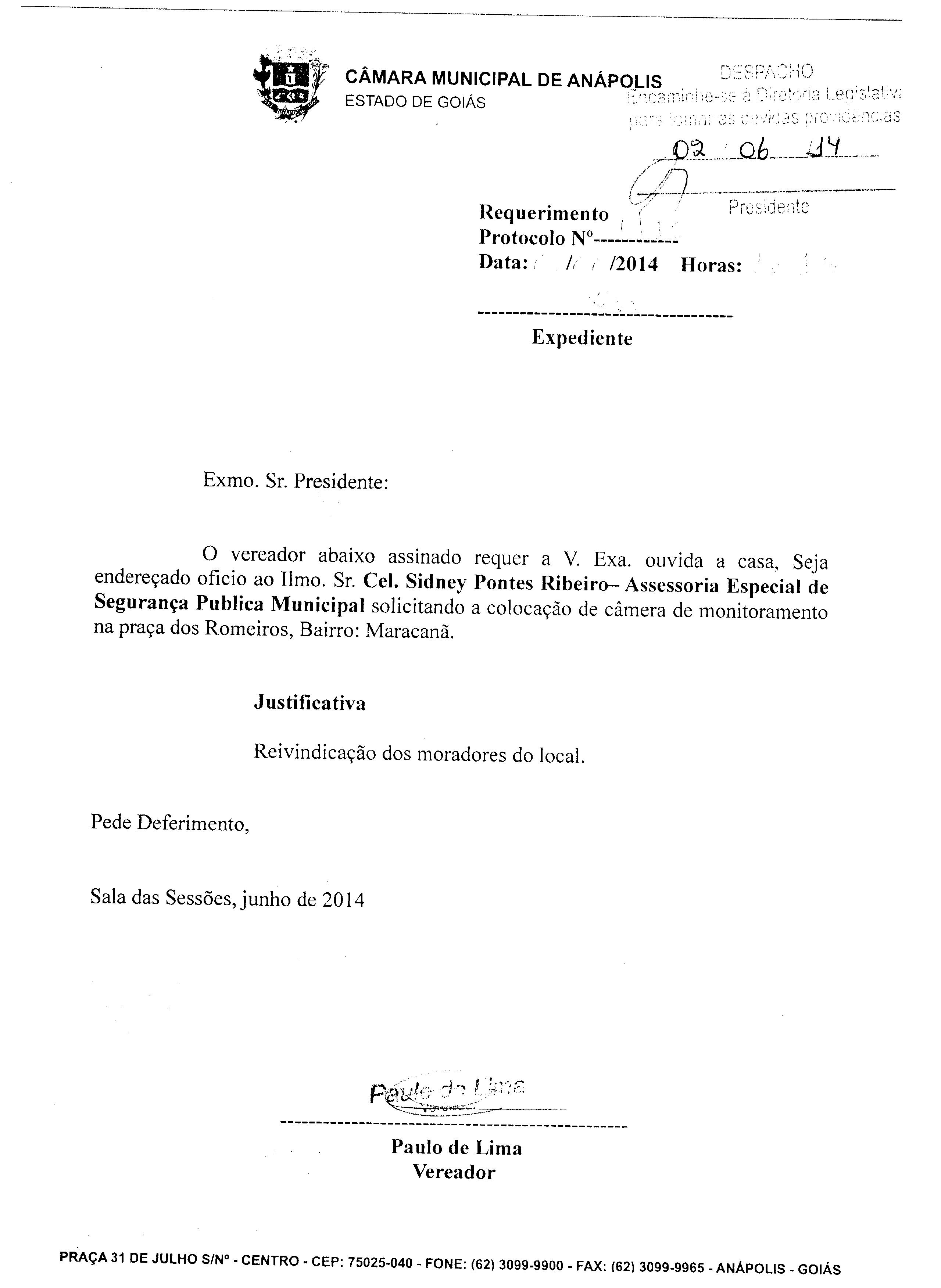 Ementa: O VEREADOR ABAIXO ASSINADO REQUER A V. EXA., OUVIDA A CASA, SEJA ENDEREÇADO OFÍCIO AO ILMO. SR. CEL. SIDNEY PONTES RIBEIRO - ASSESSORIA ESPECIAL DE SEGURANÇA PÚBLICA MUNICIPAL SOLICITANDO A COLOCAÇÃO DE CÂMERA DE MONITORAMENTO NA PRAÇA DOS ROMEIROS, BAIRRO MARACANÃ.