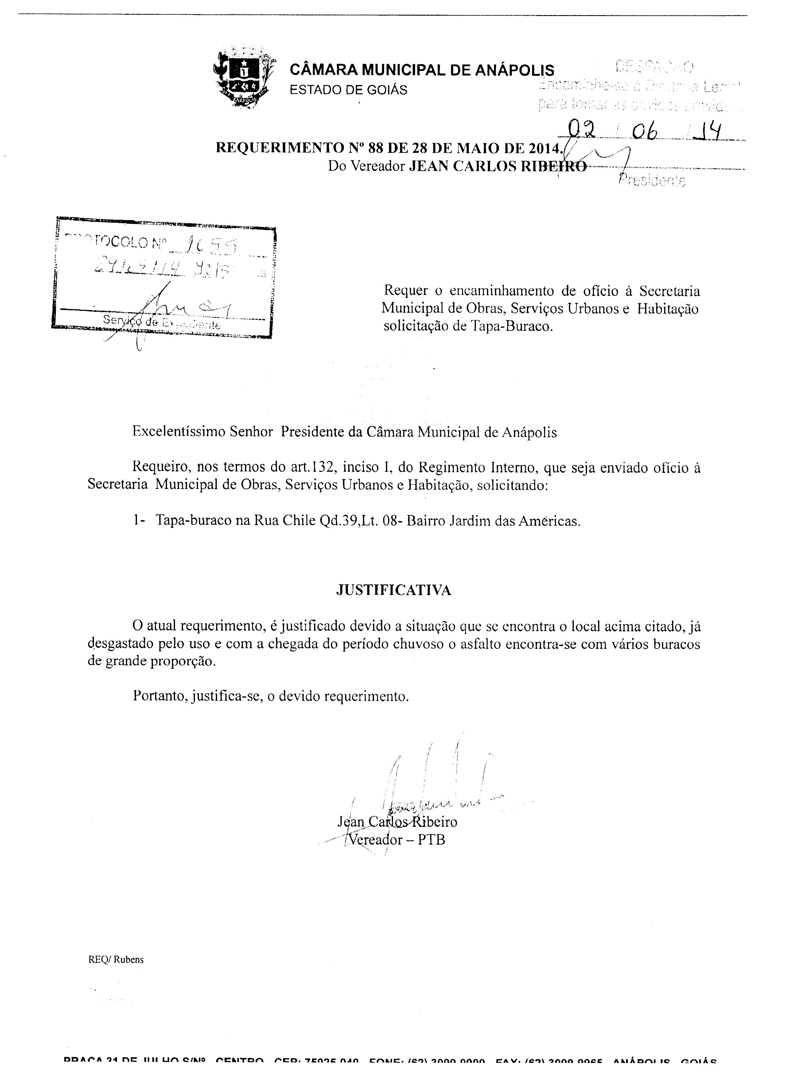Ementa: À SECRETARIA MUNICIPAL DE OBRAS, SERVIÇOS URBANOS E HABITAÇÃO, SOLICITANDO: TAPA-BURACO NA RUA CHILE QD.39, LT. 08- BAIRRO JARDIM DAS AMÉRICAS.