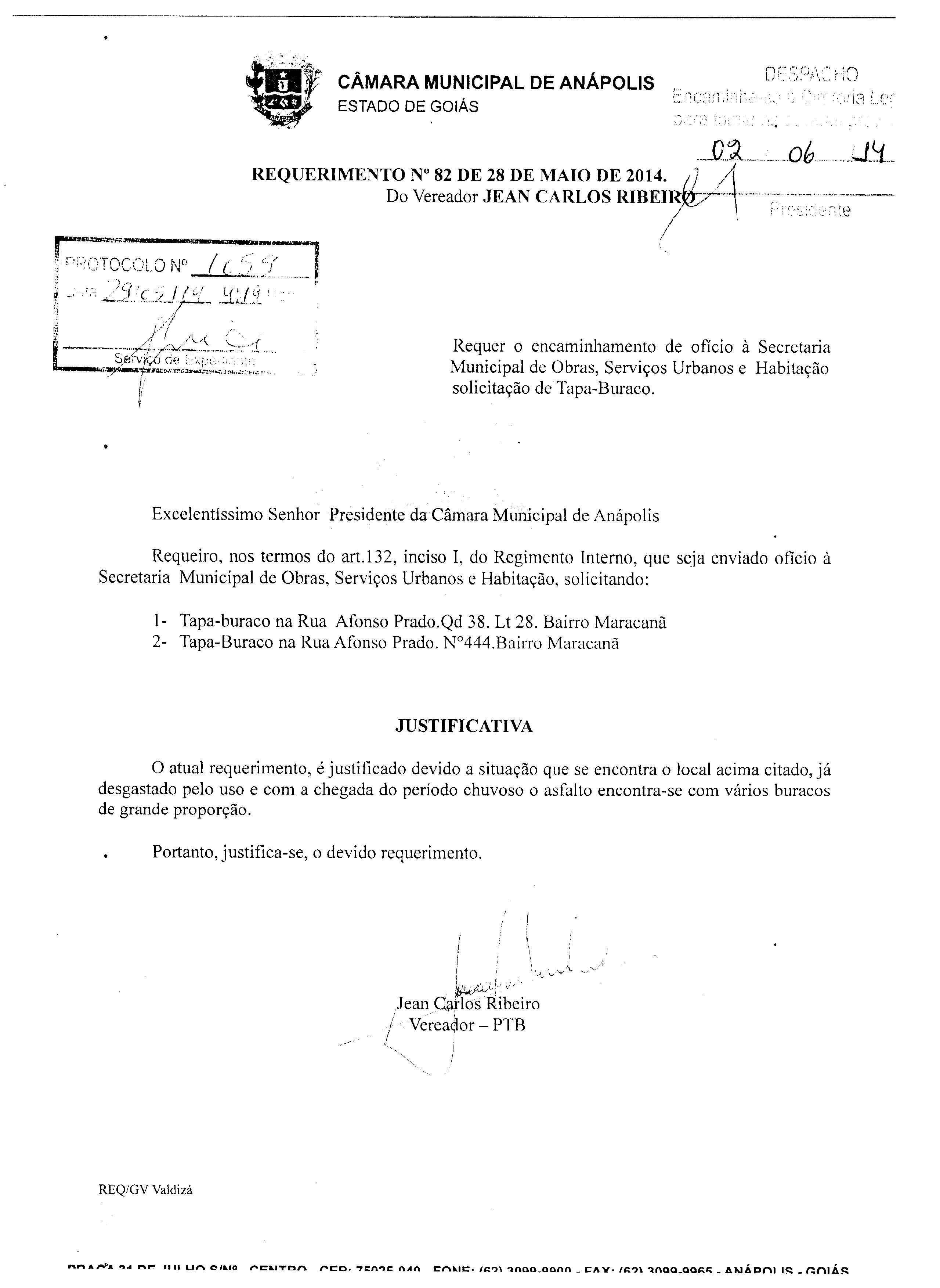 Ementa: À SECRETARIA MUNICIPAL DE OBRAS, SERVIÇOS URBANOS E HABITAÇÃO, SOLICITANDO: TAPA-BURACO NA RUA AFONSO PRADA. QD 38. LT 28, E N° 444, BAIRRO MARACANÃ.